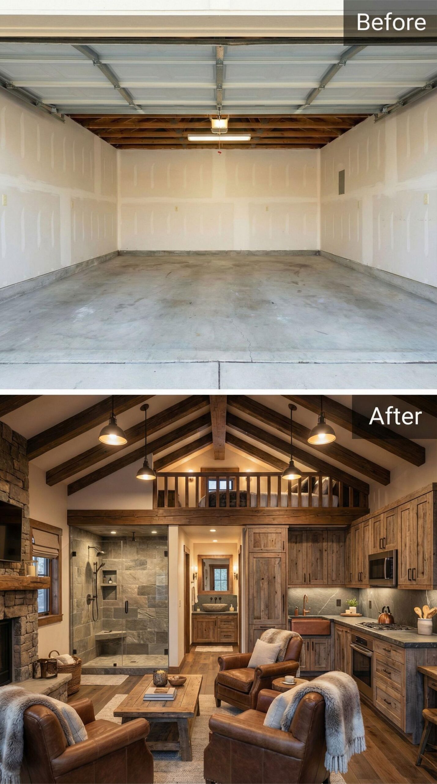 From Two-Bay Garage to Rustic Cabin-Style Studio with Loft Bedroom
