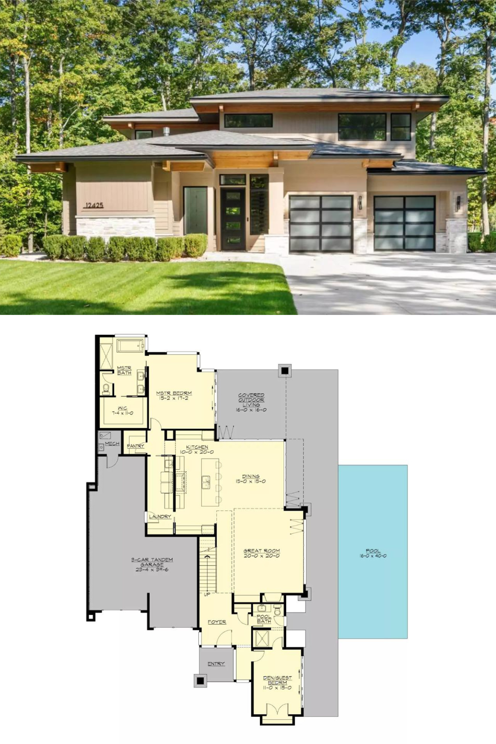 This main level showcases an open great room connecting to the dining area and kitchen. The master suite occupies the upper left corner with private bath and walk-in closet. A den or guest bedroom sits near the entry, while covered outdoor living and pool area extend the living space outdoors.