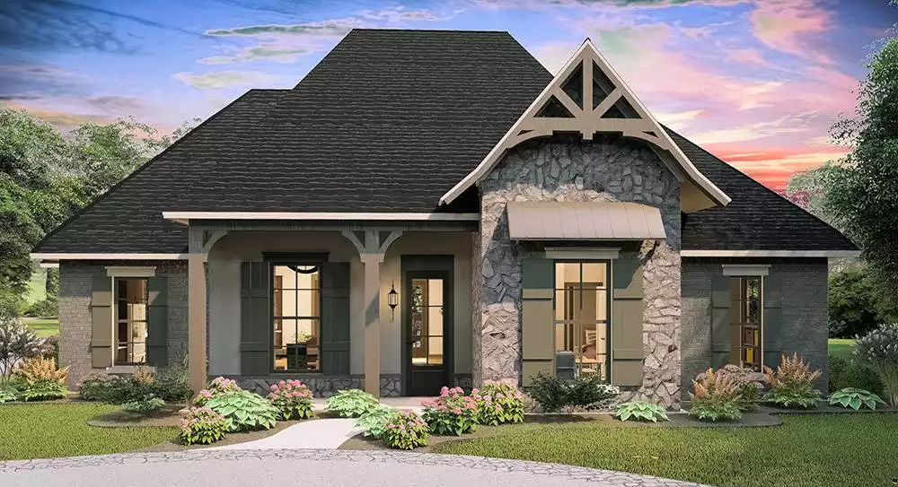 Dark gray brick wraps the exterior beneath black shingle hip roofs. Large glass doors open to a covered patio with stone pavers crossing manicured lawn. Warm interior lighting glows against the evening sky.