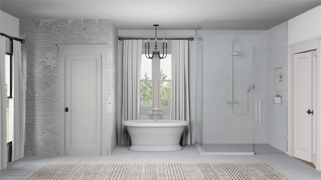 The spacious master suite houses two separate vanities, a serene soaking tub, and a generous walk-in closet that opens directly to the laundry. Near the laundry, you can also find a mud room with a built-in drop zone and powder room located conveniently off the garage entry.