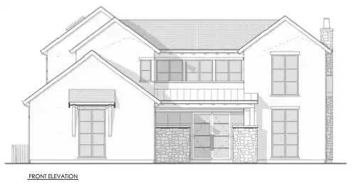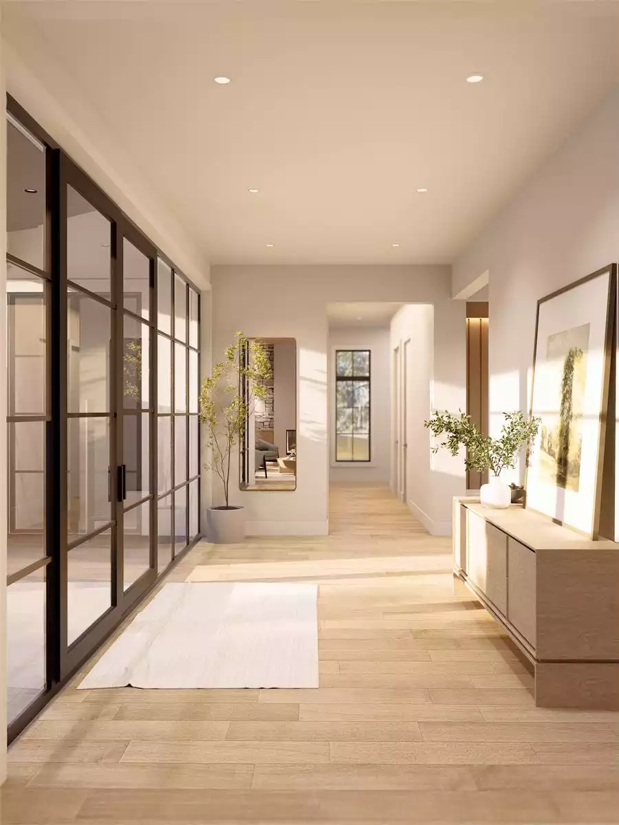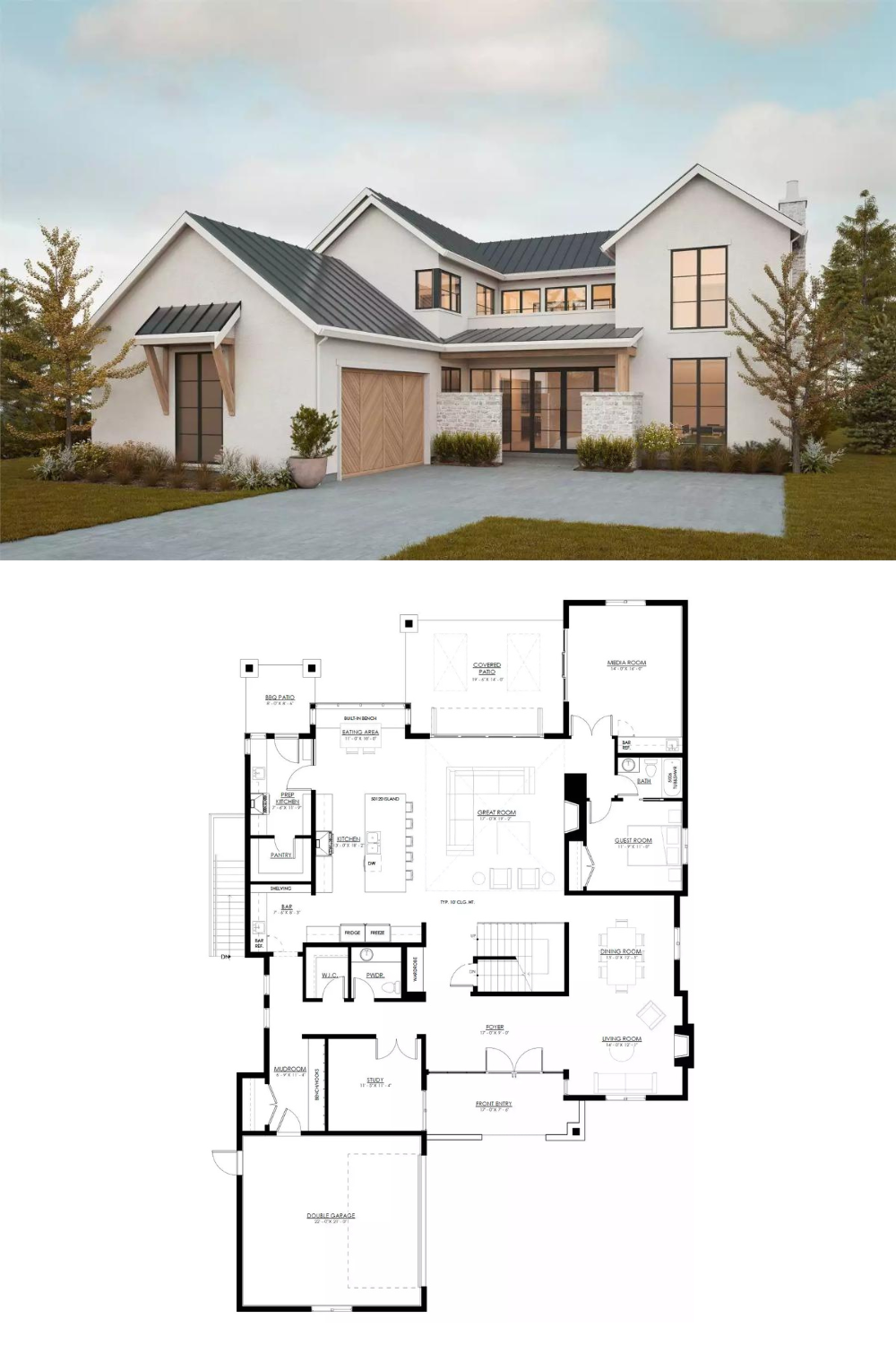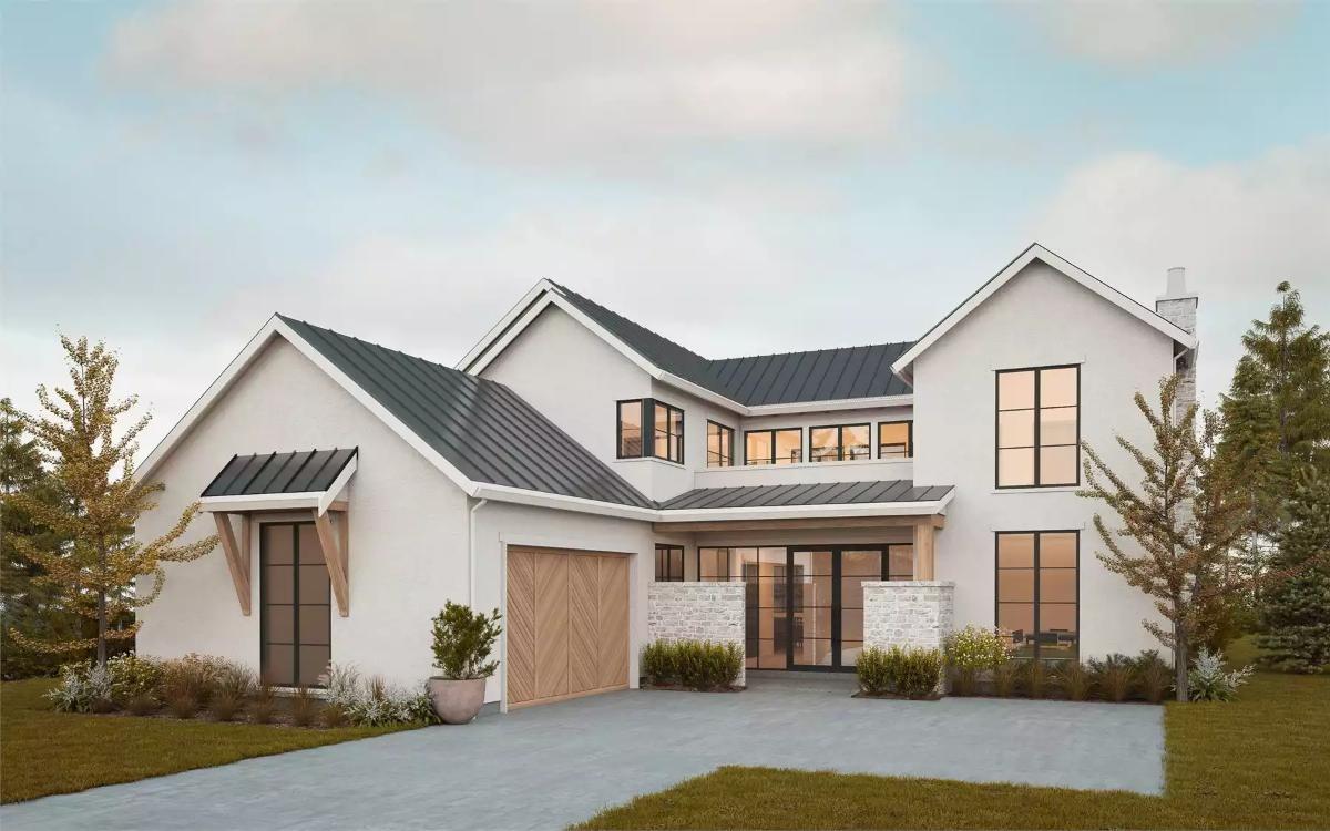 The Vista View house plan is a luxurious 4,592-square-foot contemporary home that masterfully combines sleek design with functional living. This two-story layout features five bedrooms, each with its own ensuite, including a lavish primary suite with a spa-like bathroom and walk-in closet, plus a convenient half bath for guests.