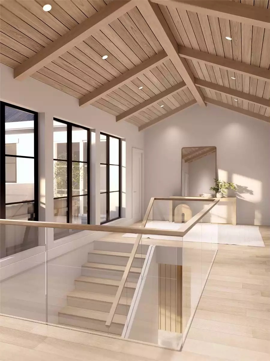 Additional highlights include a private study, flexible living spaces, and an upstairs shared balcony. Floor-to-ceiling windows bathe the home in natural light, while the outdoor living areas, including covered porches and a patio, invite relaxation.