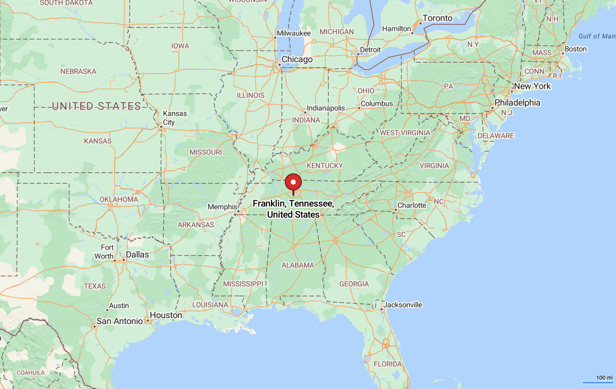 Franklin, Tennessee, is located in Williamson County, south of Nashville. It is approximately 30 kilometers from downtown Nashville, making it a convenient suburban location with historical significance. The city is surrounded by other prominent areas, including Brentwood to the north and Spring Hill to the south. Franklin is well-connected by major highways, offering easy access to neighboring regions in Middle Tennessee.