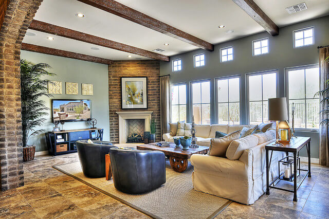 A closer view of the living room shows the angled wall covered in adobe bricks. The veneer easily blends into, yet provides a stark contrast in color and texture to the gray-green paint and white fireplace mantle. The stone floors are covered by a large beige area rug.