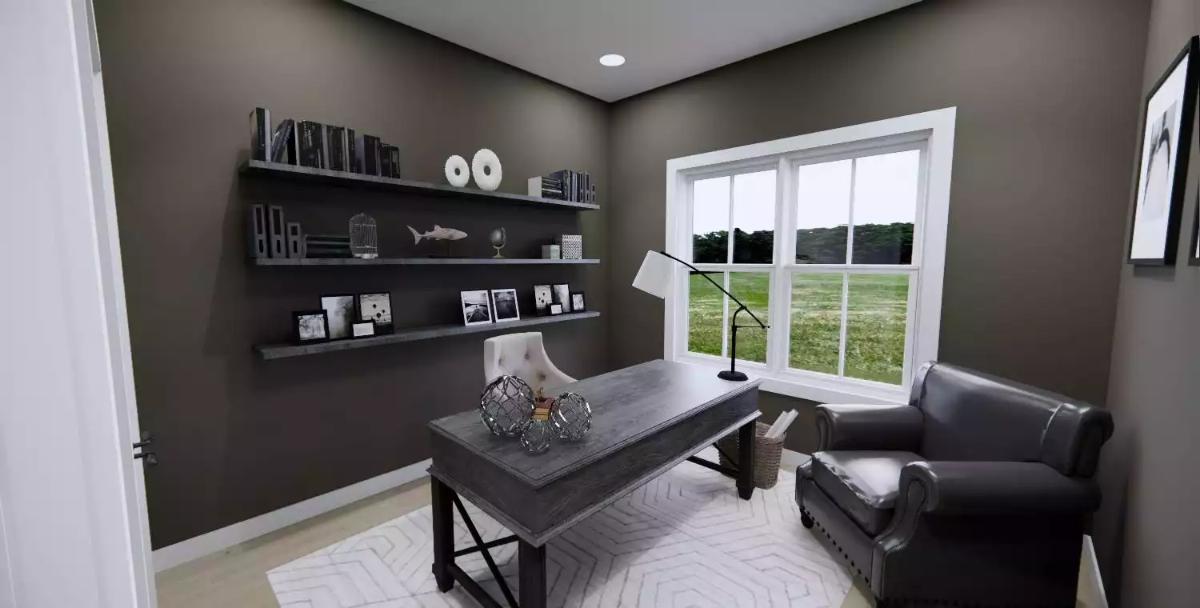 A kitchen island, pantry, and peninsula eating bar provide generous prep space and casual seating for family and guests. The primary bedroom is located on the main floor and features a walk-in closet and a bathroom with double vanity sinks. Split bedrooms help maintain privacy, while a dedicated home office supports work-from-home needs.