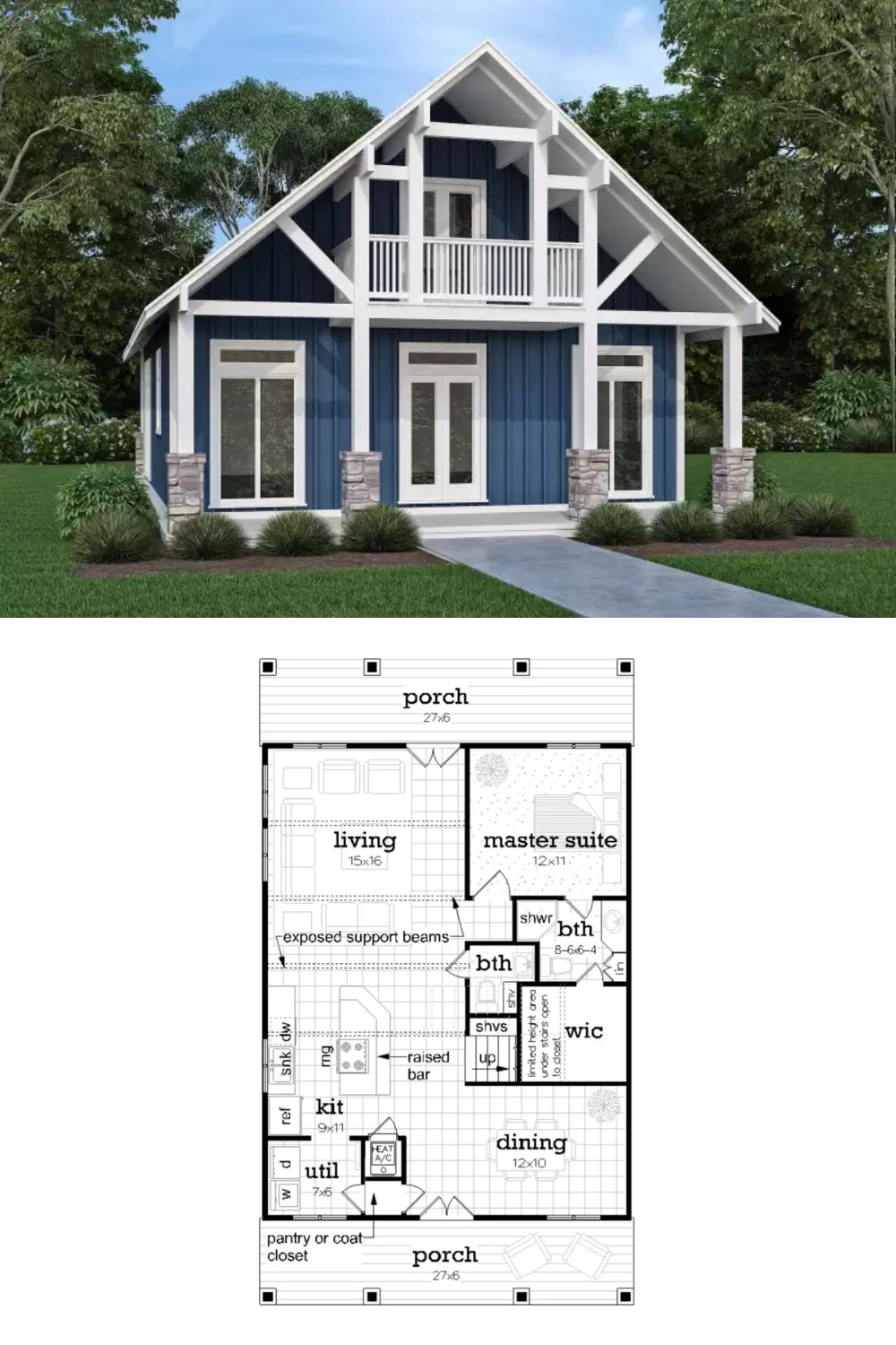The master suite opens directly from the living room, giving parents a private zone separated from the secondary bedrooms upstairs. The living room flows into the dining area with exposed support beams defining the zones. A raised bar separates the kitchen from the living space. Two full bathrooms share a central shvs closet. The utility room connects to a walk-in closet. Porches span the front and rear.