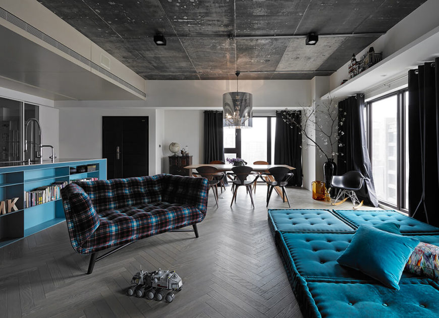 The bright aquamarine sofa set can be combined and rearranged in any way the owners see fit at a given moment. It’s the perfect piece of furniture to tie this open space together.