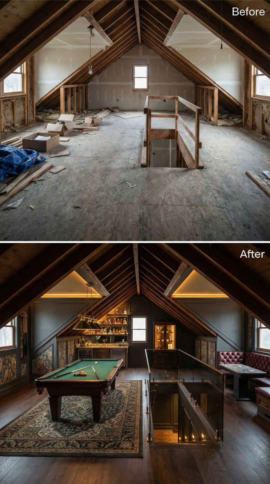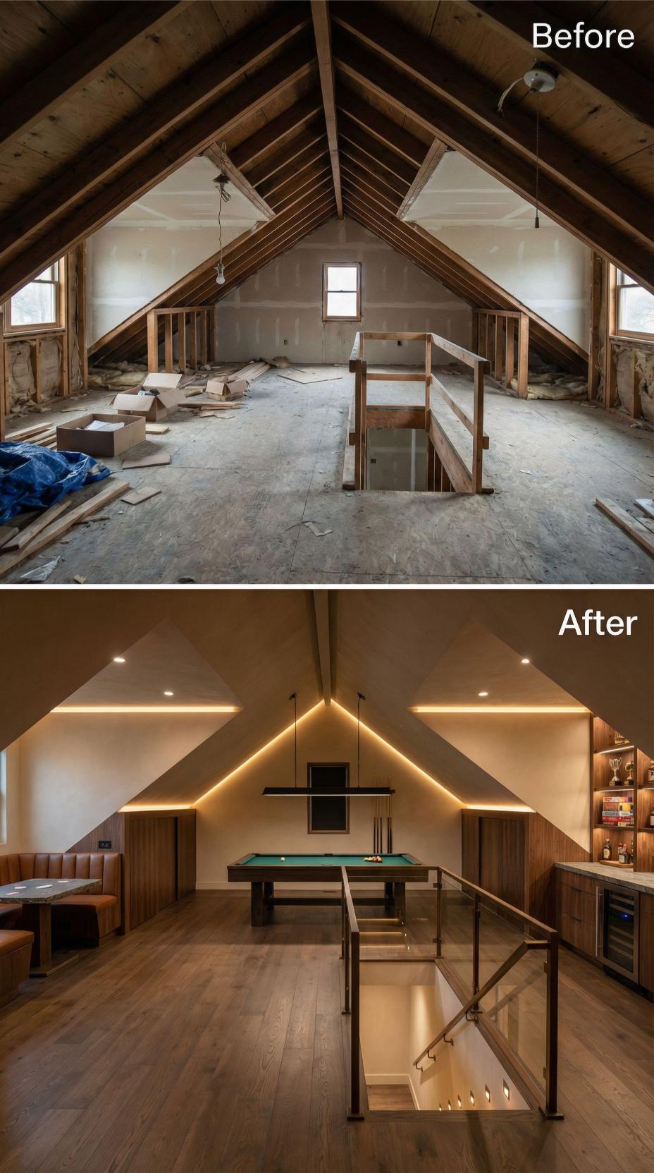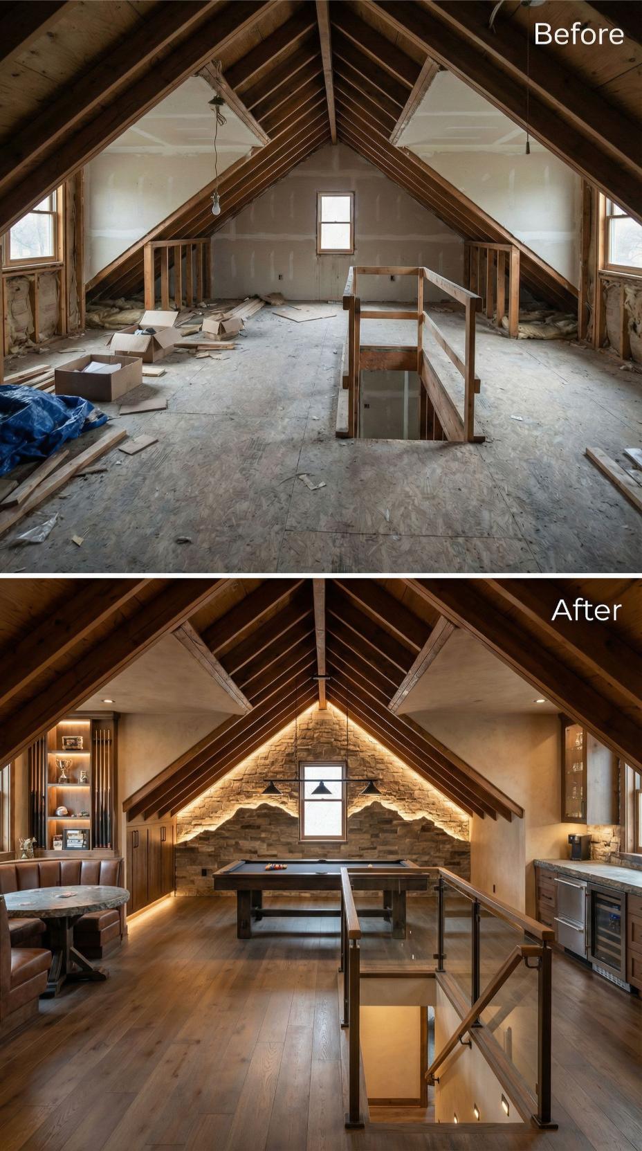 Exposed wood beams now frame this stunning transformation, where stone accent walls with dramatic lighting create an inviting focal point. Rich hardwood floors replace bare subflooring, while custom built-ins and a sleek bar area maximize the angular space. Pool table positioning and warm LED strip lighting turn awkward attic angles into cozy entertainment zones perfect for hosting.