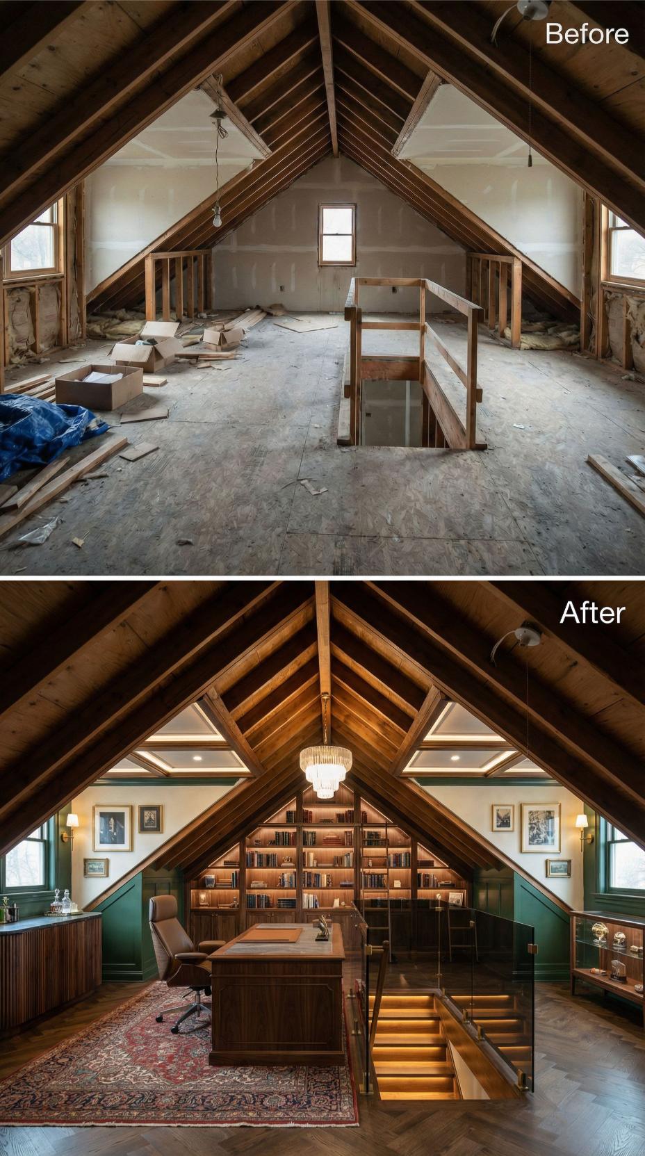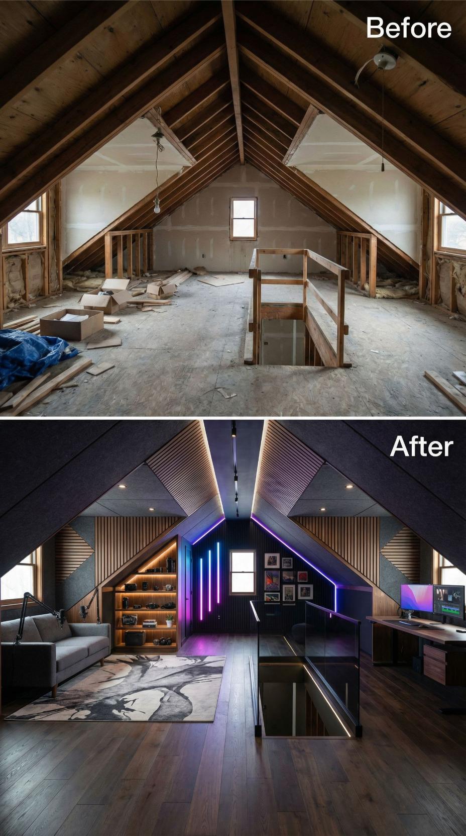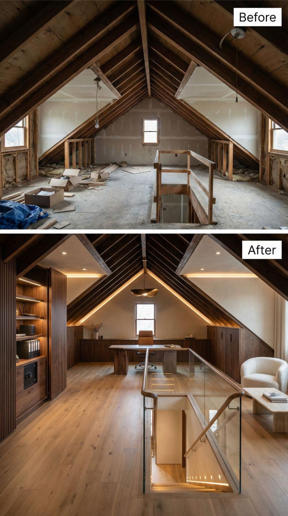 Raw exposed beams and scattered construction debris gave way to a stunning workspace that maximizes every angle of this transformed attic. Warm walnut built-ins wrap the perimeter walls, creating seamless storage while preserving the dramatic vaulted ceiling. Strategic LED strip lighting illuminates the natural wood grain, while glass railings maintain sight lines across the open floor plan below.