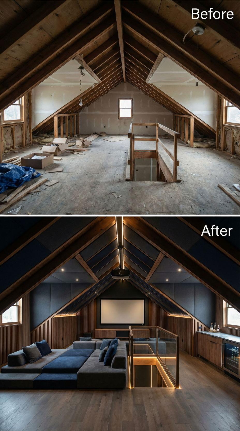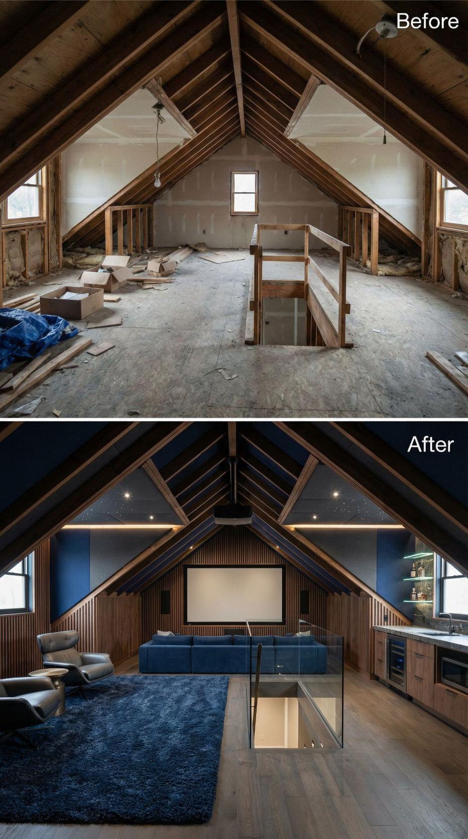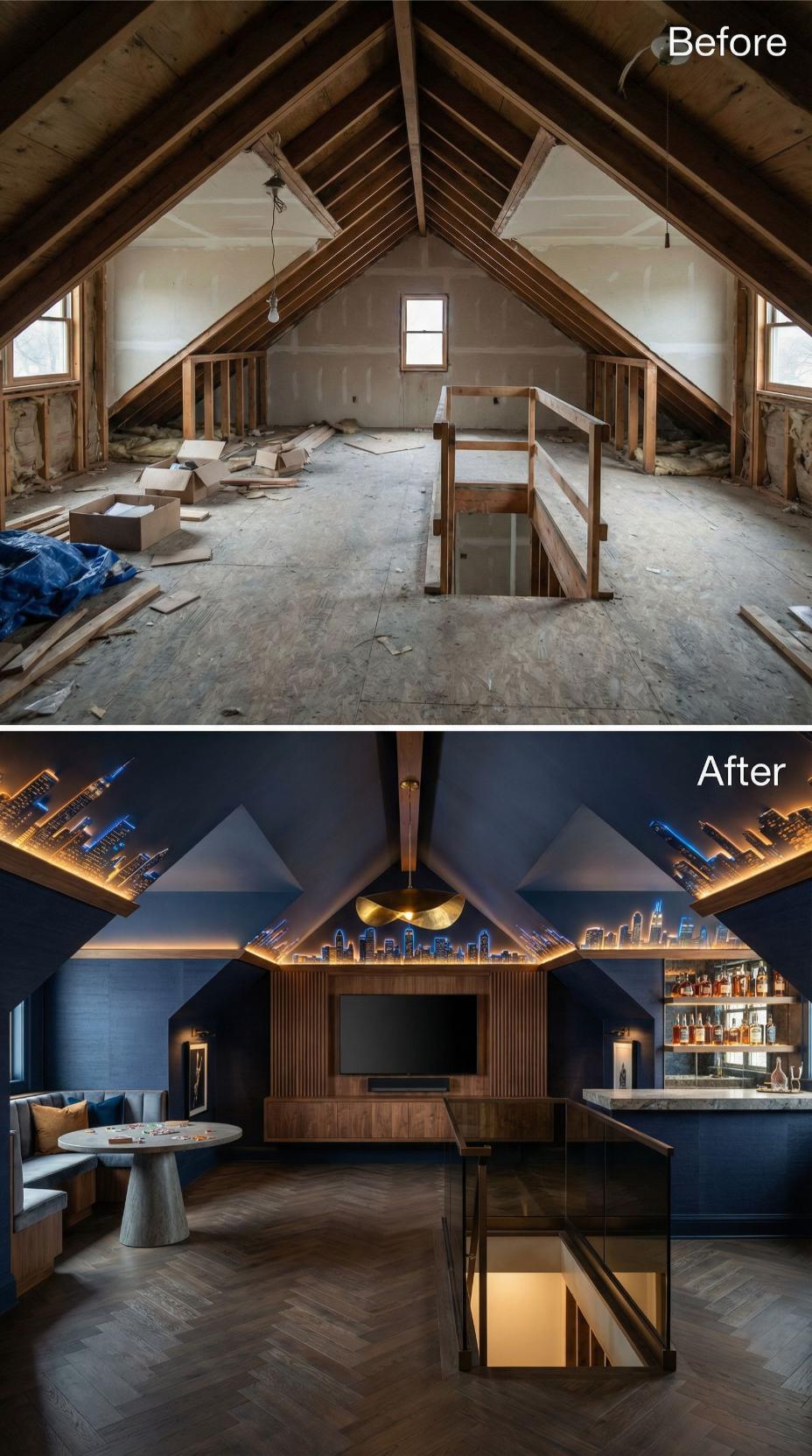 Raw exposed rafters and scattered construction debris gave way to a sleek entertainment sanctuary wrapped in rich navy walls. Warm wood paneling frames the media center while brass pendant lighting creates intimate ambiance. The former unfinished space now boasts a stylish bar area, cozy seating nook, and herringbone flooring that transforms this attic into a refined retreat.