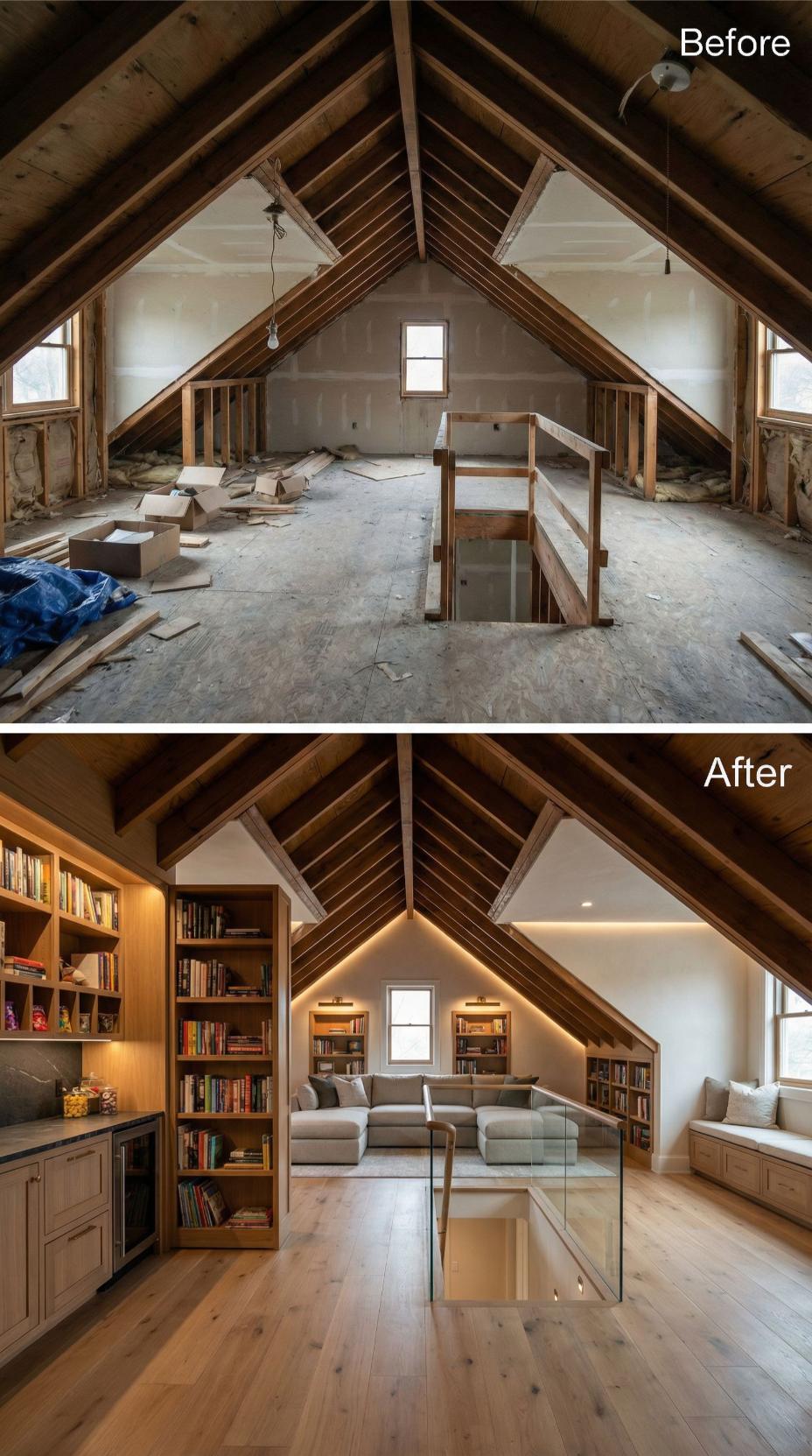 Exposed wooden beams now frame a luxurious reading sanctuary where built-in walnut bookshelves replace bare walls and scattered debris. Glass railings create safety around the stairwell opening while maintaining visual flow throughout the transformed space. Warm LED strip lighting highlights the cathedral ceiling’s architectural beauty, while a plush sectional sofa anchors the seating area. Rich hardwood flooring and integrated window seating complete this stunning metamorphosis from construction chaos to literary haven.