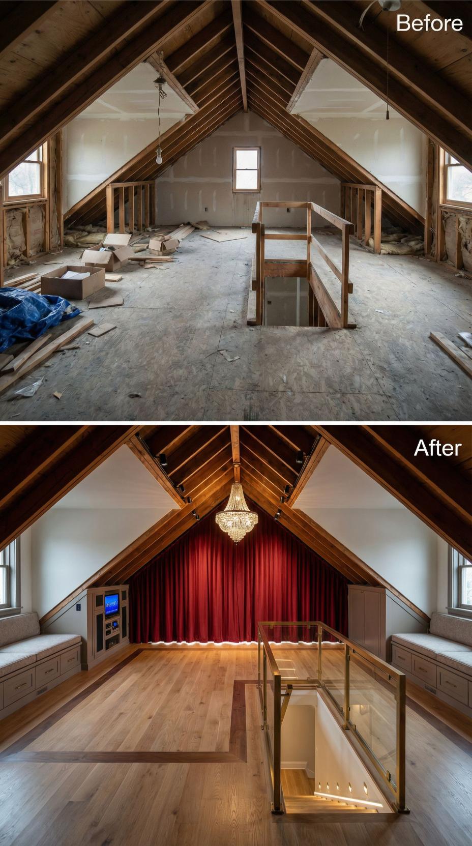 Raw exposed beams and scattered construction debris gave way to a stunning entertainment space featuring rich hardwood flooring and dramatic red velvet curtains. The crystal chandelier creates elegant ambiance while built-in storage benches maximize functionality. Modern glass railings provide safety without compromising the open, airy feel of this transformed theatrical retreat.