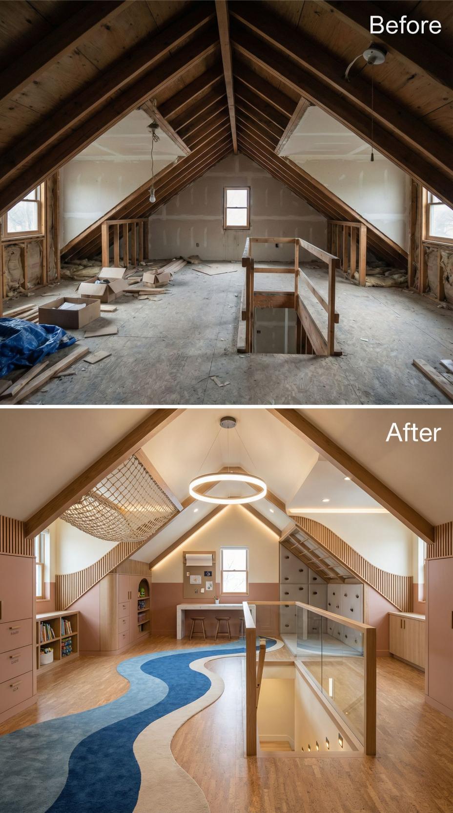 Raw exposed beams and scattered debris transformed into an enchanting children’s haven featuring warm wood paneling and innovative climbing elements. The builder grade attic now showcases a stunning rope net suspended between rafters, curved blue river-pattern flooring, and clever built-in storage cubes that double as climbing holds. Modern circular pendant lighting and glass railings complete this adventure-ready space.