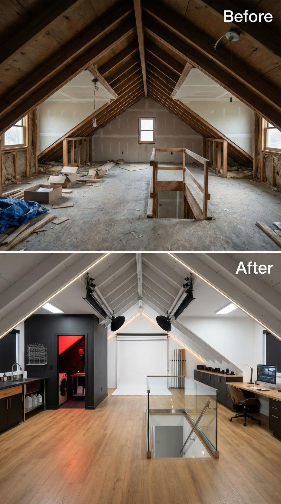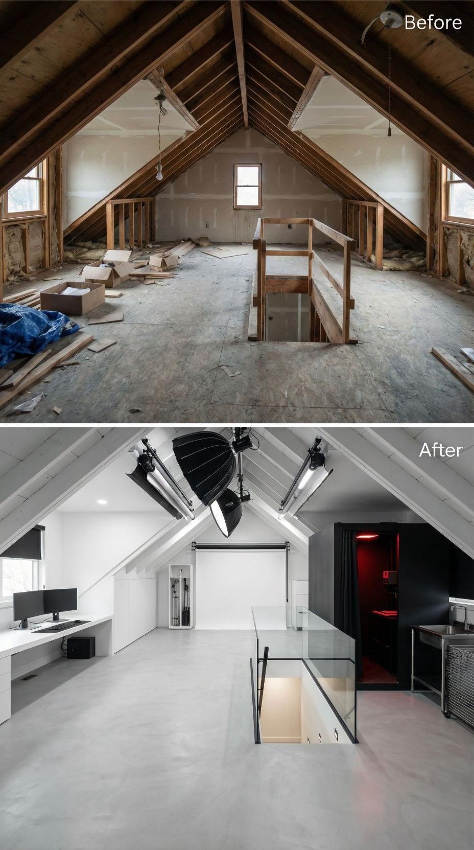 Raw exposed beams and scattered debris gave way to a sophisticated creative workspace bathed in pristine white. Professional photography equipment now occupies the transformed space, while sleek glass railings and polished concrete floors create an industrial-modern aesthetic. Strategic lighting and minimalist design elements maximize the attic’s soaring cathedral ceiling, proving that builder grade bones can support extraordinary reinvention.