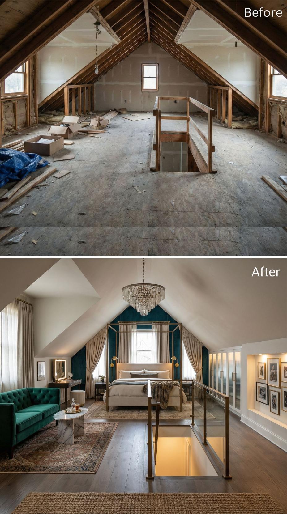 The attic is where a house sends its unfinished thoughts: spare lumber, seasonal boxes, and that one lamp nobody admits buying. Then you look up and realize the geometry is the best room you own — cathedral rafters, pockets of light, a built-in sense of drama — currently wasted on dust and good intentions. This gallery treats the loft like prime real estate, not purgatory, with luxurious makeovers that turn overhead space into headline space.