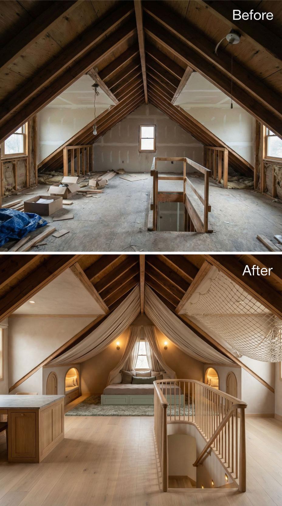 From Builder Grade Attic to Cozy Reading Retreat with Suspended Hammock