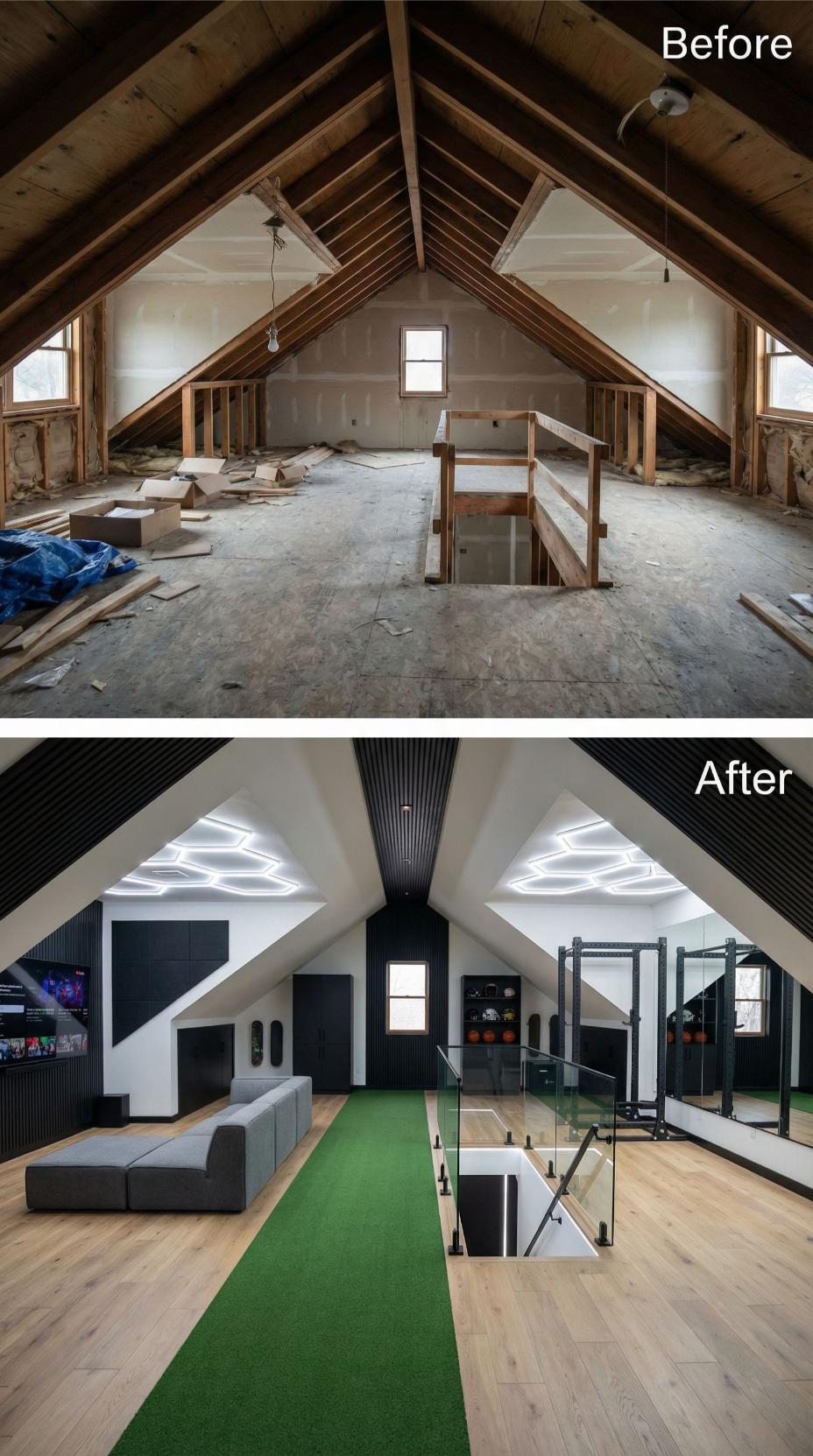 Raw exposed beams and scattered construction debris gave way to a sophisticated home gym that maximizes every angle of this vaulted space. Dark accent walls create dramatic contrast against crisp white surfaces, while professional-grade equipment transforms the once-unfinished area into a dedicated fitness retreat. Strategic lighting illuminates workout zones, and the artificial turf strip adds functional training space beneath soaring timber frames.