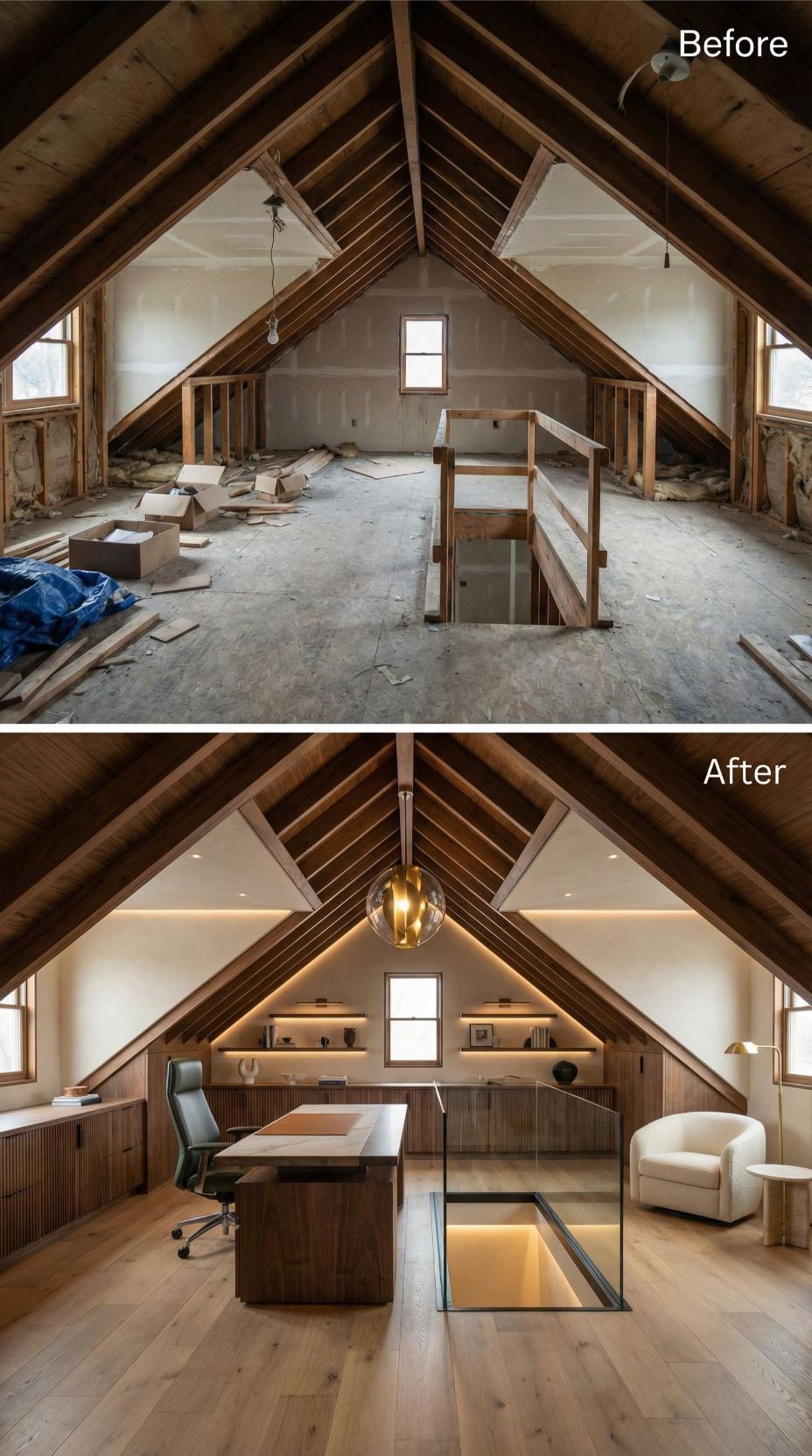 Raw exposed beams and scattered construction debris gave way to a stunning workspace that maximizes every angle of this sloped ceiling. Warm walnut built-ins wrap the perimeter, creating seamless storage while LED strip lighting highlights the architectural bones. The glass floor panel adds unexpected drama, transforming the stairwell opening into a modern design feature that floods the lower level with natural light.