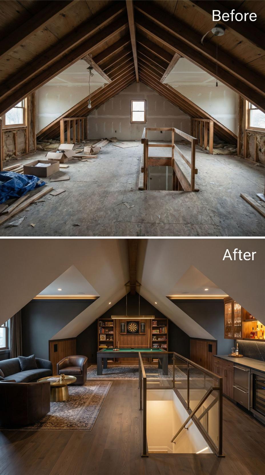 Raw exposed beams and scattered construction debris transformed into a polished gentleman’s retreat featuring rich walnut built-ins and moody charcoal walls. The space now boasts a dedicated pool table area, cozy seating nook with leather furnishings, and a sleek wet bar tucked beneath the eaves. Warm wood tones complement the dark paint palette while strategic lighting highlights architectural details.