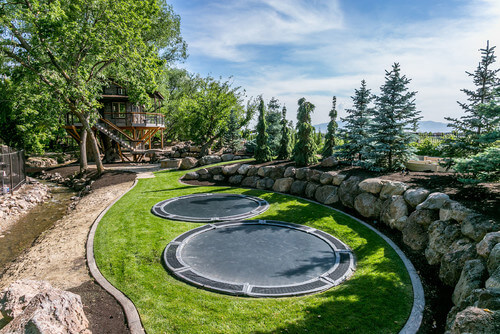 Even in minimal yard space a trampoline can be an amazing accessory. This buried trampoline works great in this compact yard, making the perfect addition of fun. Buried trampolines also get around the mowing problem.