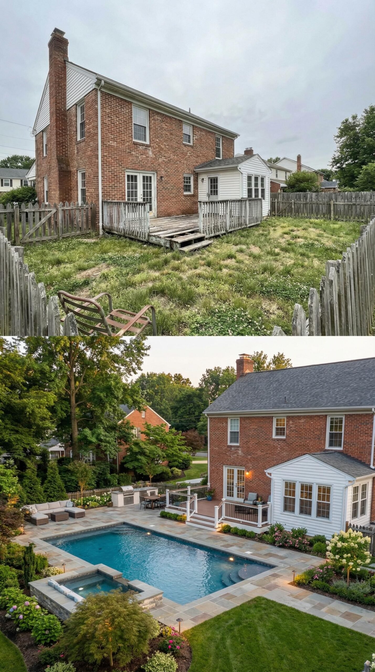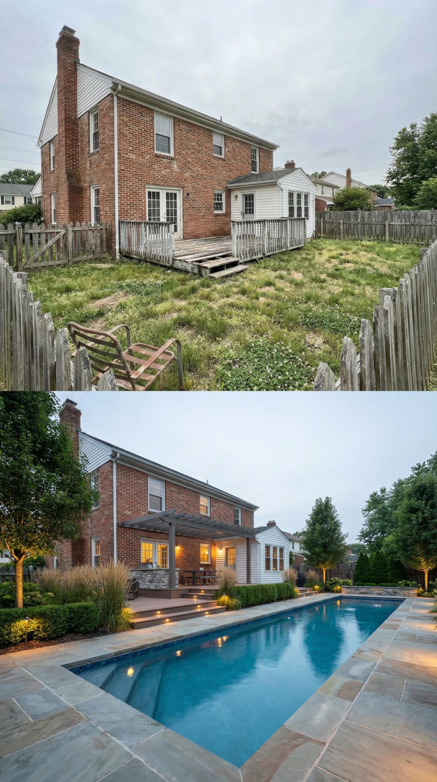 Strategic landscape design transforms this overgrown backyard into an entertainment oasis featuring a stunning rectangular pool surrounded by natural stone pavers. Professional lighting illuminates ornamental grasses and creates dramatic shadows across the water’s surface. The extended deck with pergola provides perfect outdoor dining space while maintaining the home’s classic brick architecture.