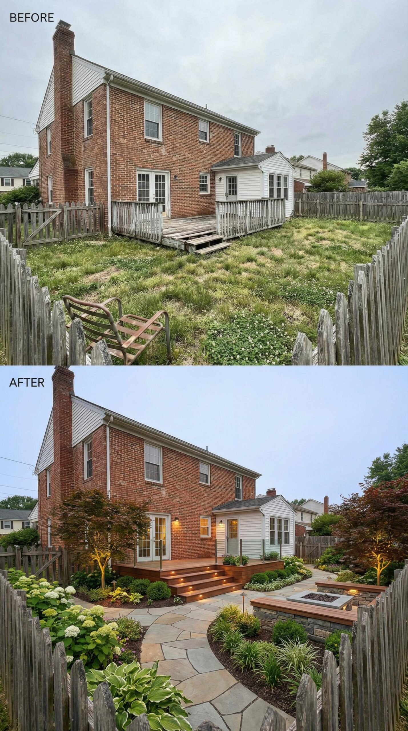 Strategic landscaping transforms this neglected backyard into an elegant outdoor retreat. Professional flagstone pathways wind through carefully planned garden beds filled with colorful hydrangeas and manicured boxwood hedges. The new cedar deck with matching railings creates perfect entertaining space, while thoughtful plant placement adds year-round structure and seasonal blooms that elevate the entire property value.