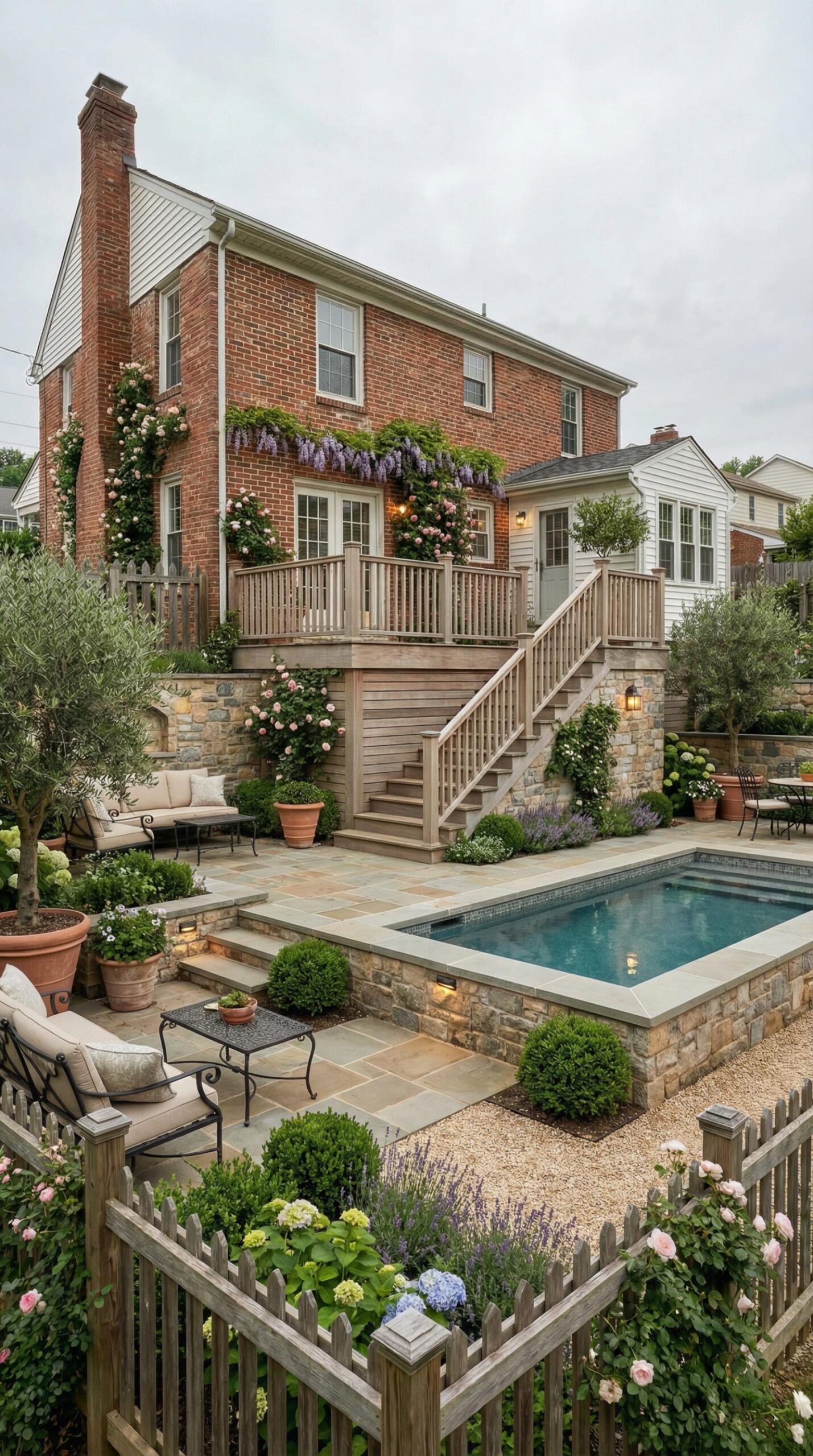 Climbing roses and wisteria transform this brick home’s facade while a sophisticated two-tier deck creates distinct entertaining zones. Natural stone coping frames the compact pool, complemented by flagstone patios and manicured boxwood hedging. Wrought iron furniture with plush cushions anchors seating areas, while strategic lighting extends enjoyment into evening hours across this beautifully layered landscape.