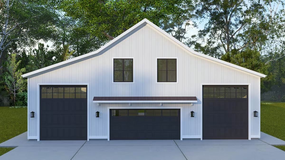 This barndominium-style home features a clean, straightforward exterior defined by crisp vertical siding, a simple gable roofline, and a strong garage-forward presence. Three oversized garage bays create a bold, functional faรงade while maintaining a balanced and intentional look.