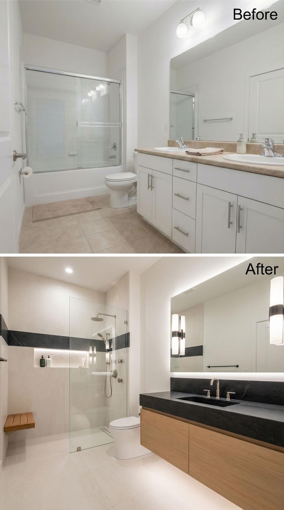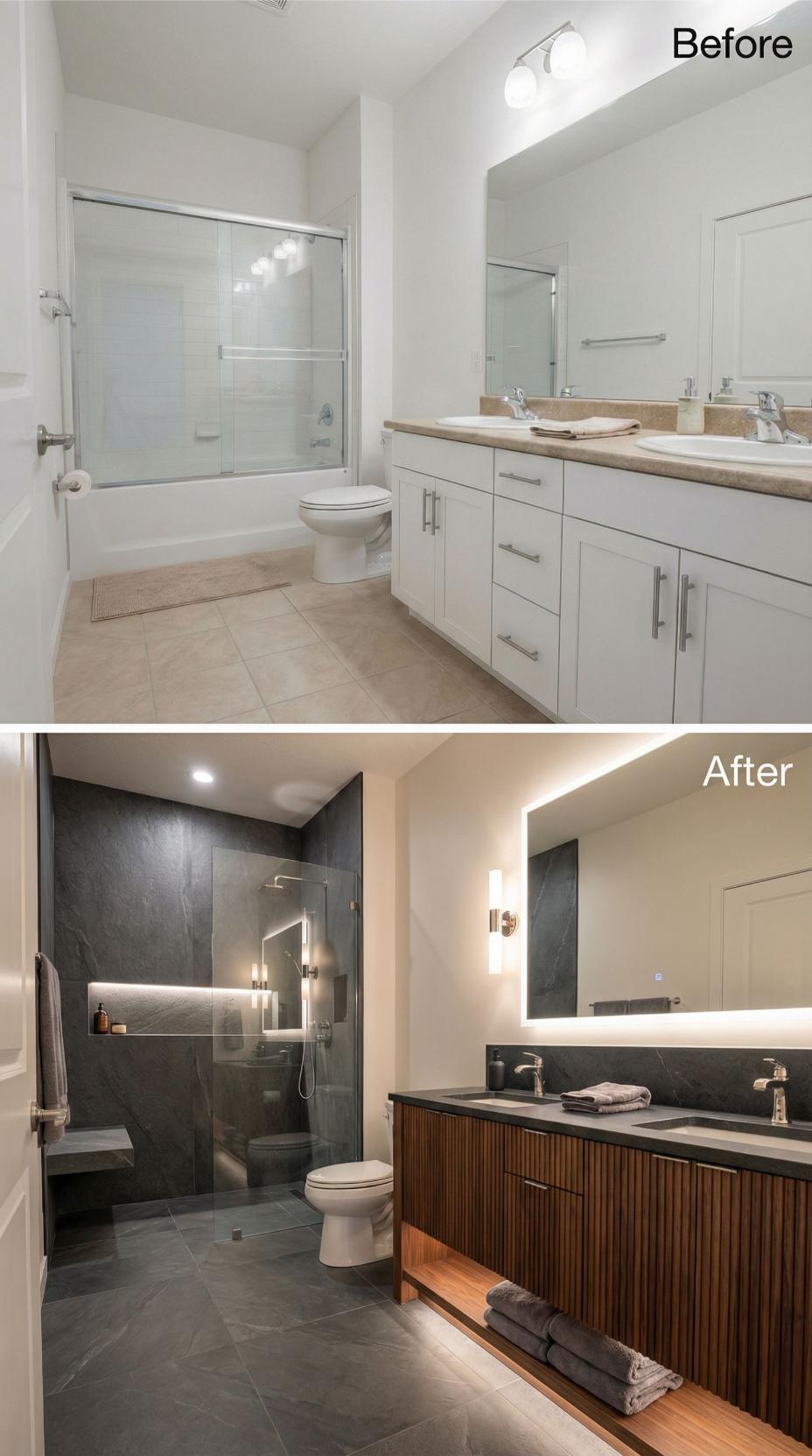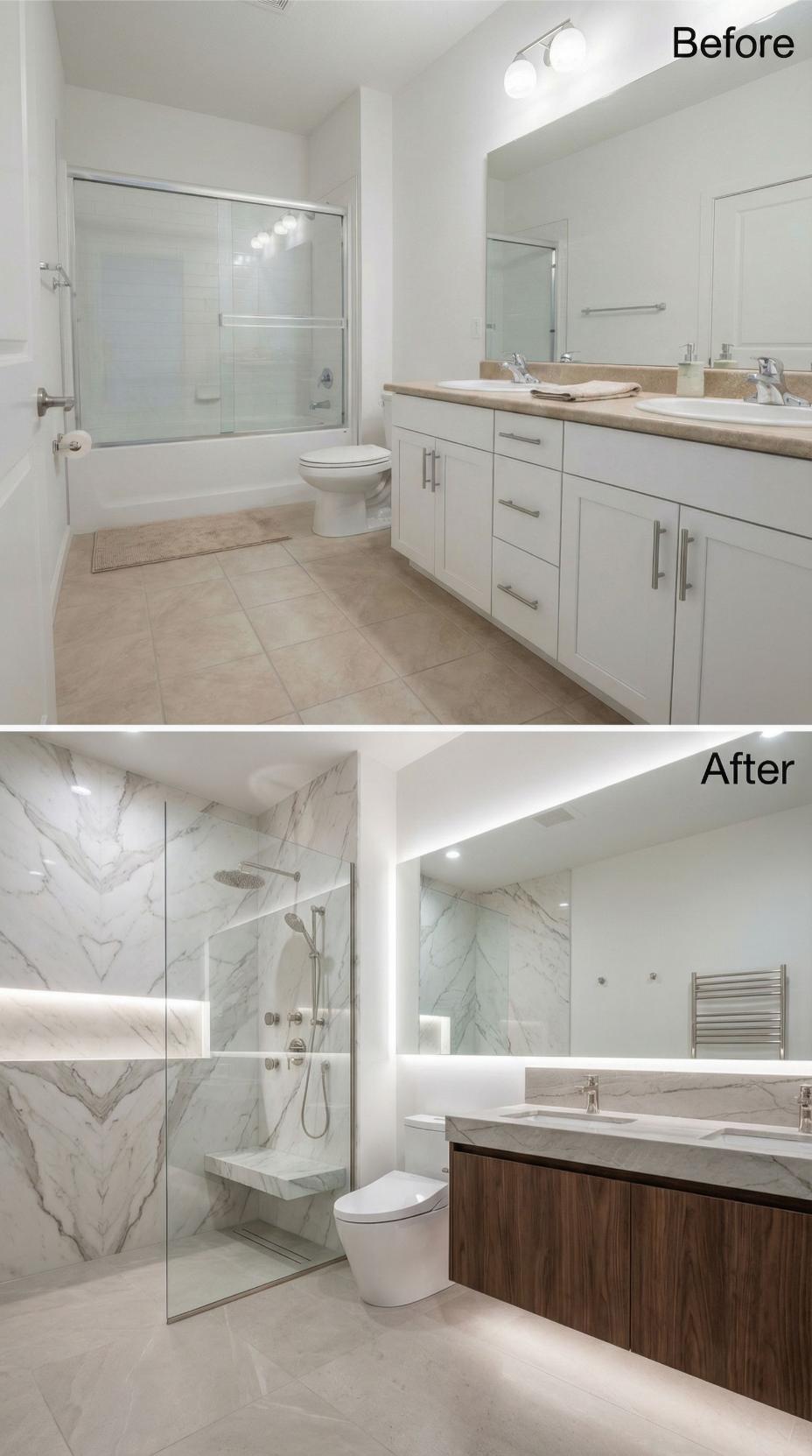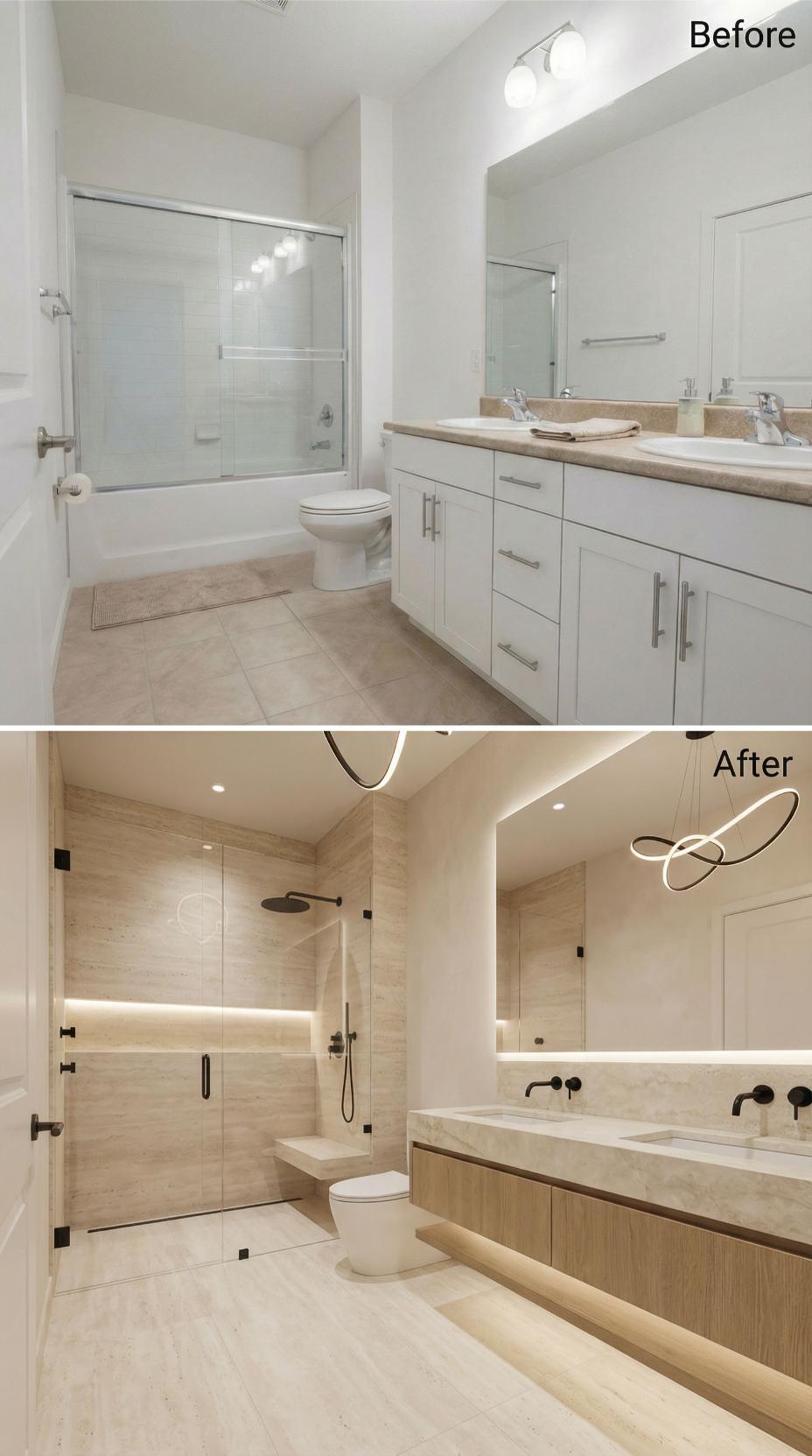 Warm wood vanity cabinetry replaces stark white builder grade elements, while sophisticated lighting transforms this ordinary bathroom into a serene sanctuary. Large format neutral tiles create seamless walls, and the floating vanity design maximizes visual space. Strategic LED strip lighting beneath the mirror and within wall niches adds dramatic ambiance that elevates every daily routine.