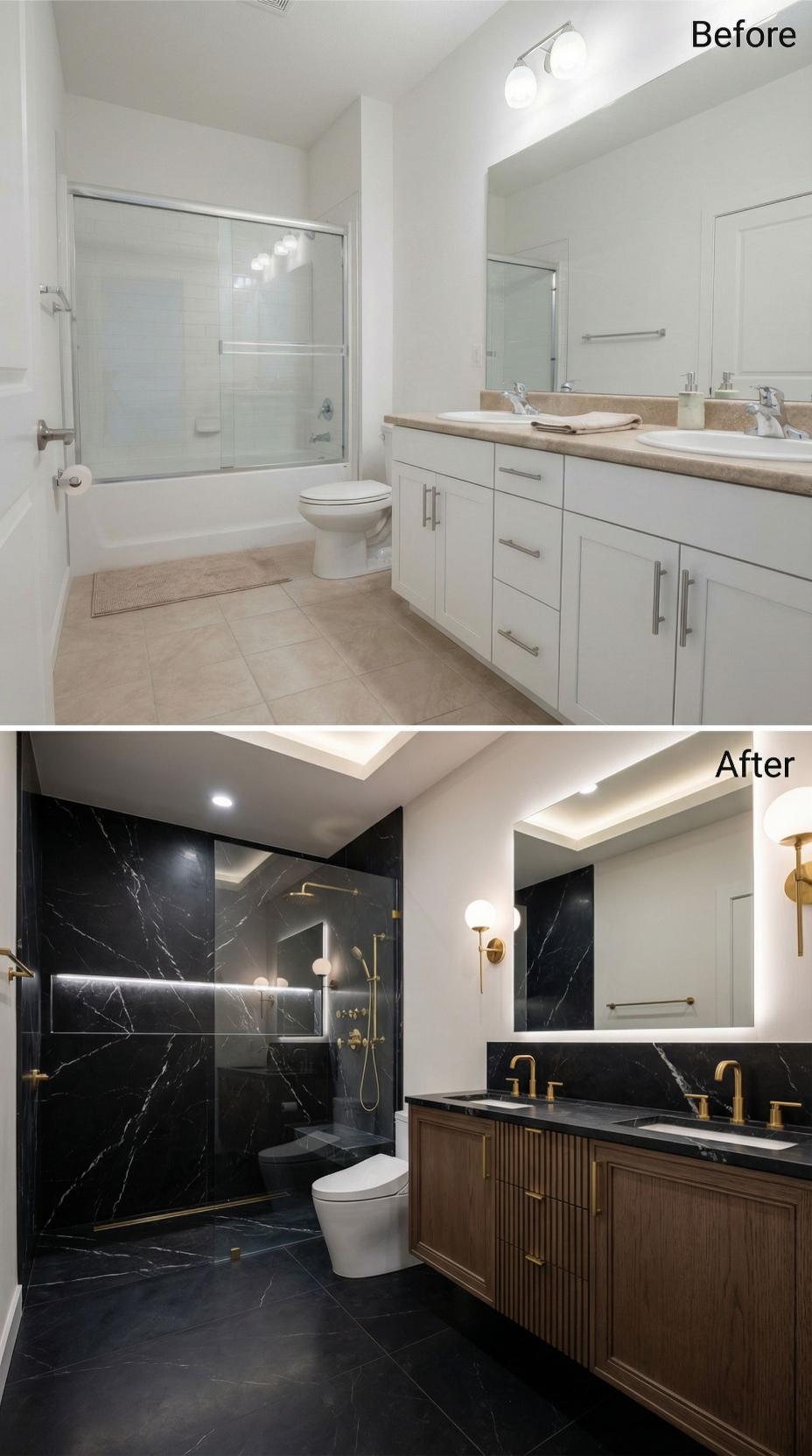Dramatic black marble with white veining completely transforms this builder grade bathroom into a sophisticated retreat. Gold fixtures and hardware elevate the vanity from basic white cabinetry to rich walnut with fluted detailing. Recessed lighting and LED strip accents create ambient layers while the frameless glass shower becomes a stunning marble showcase.