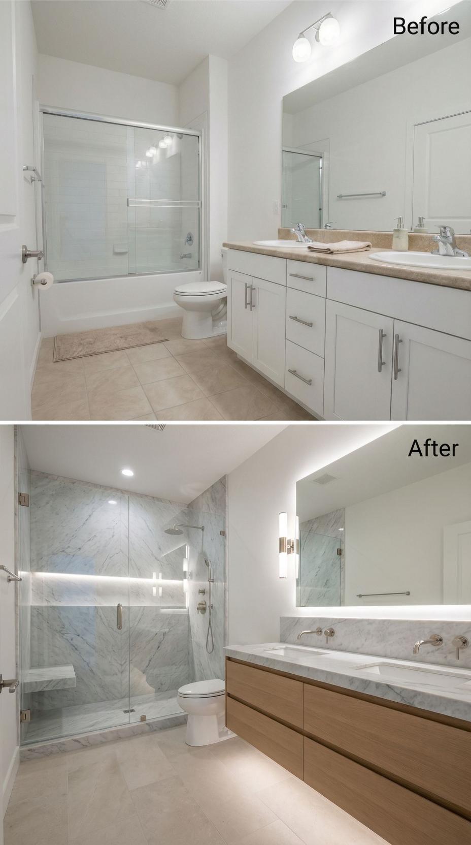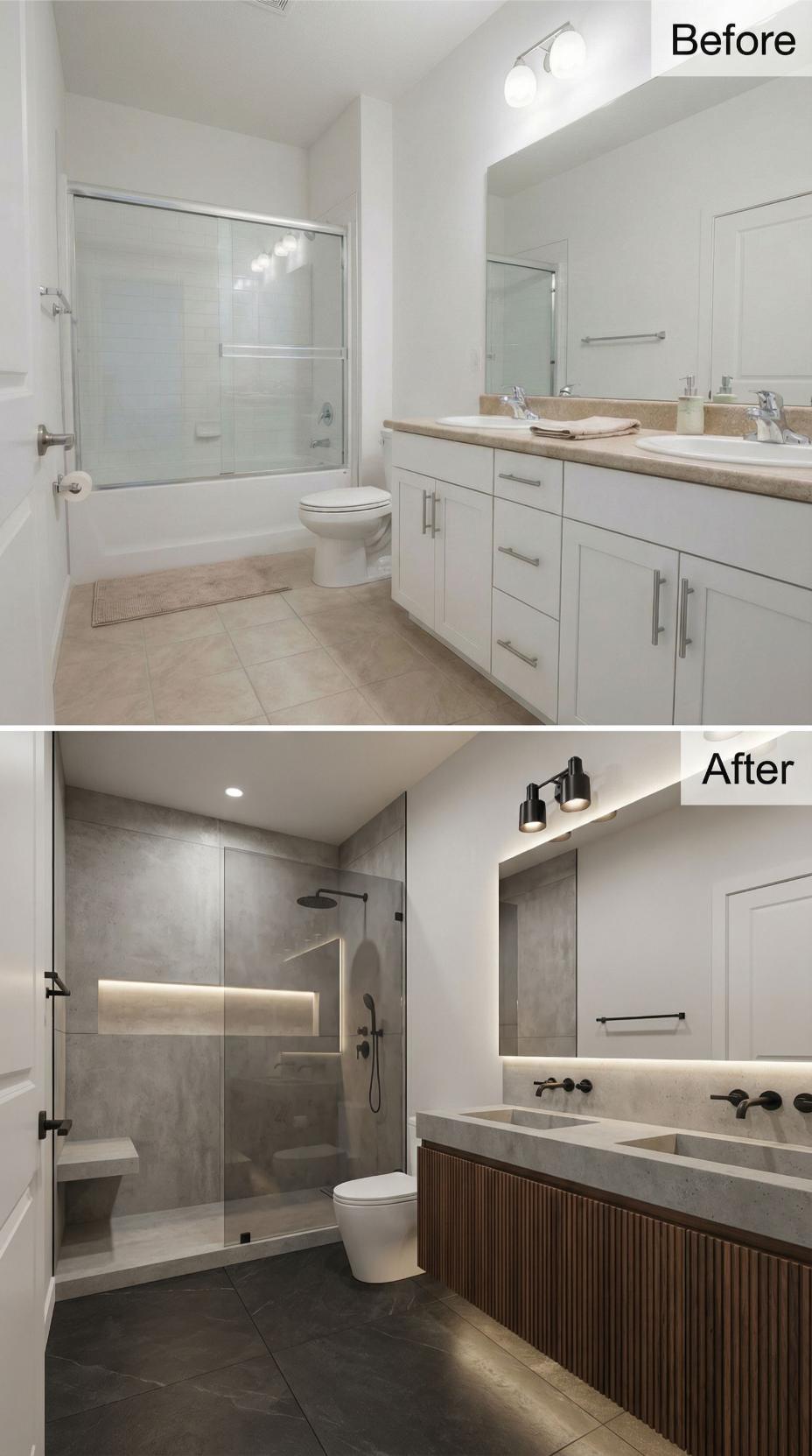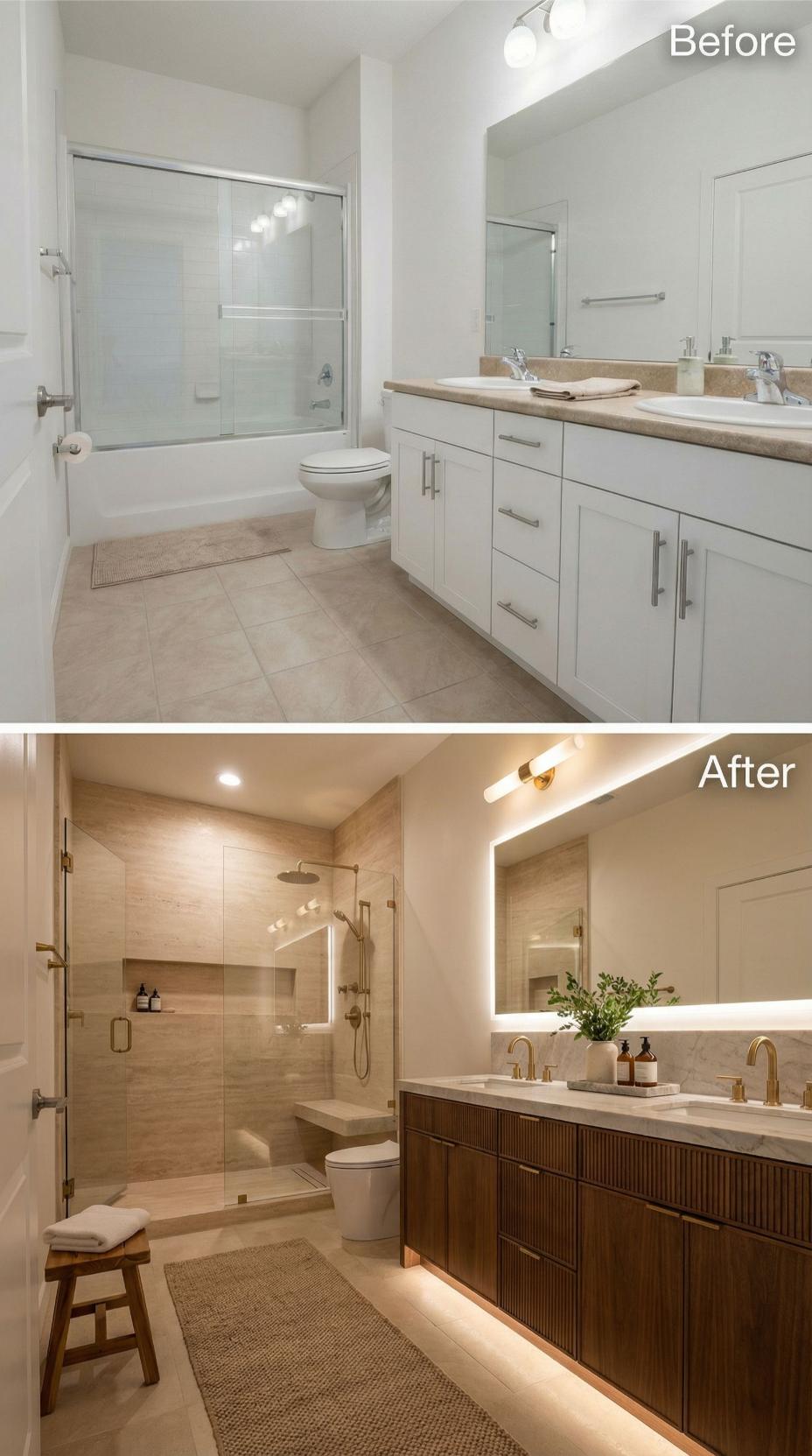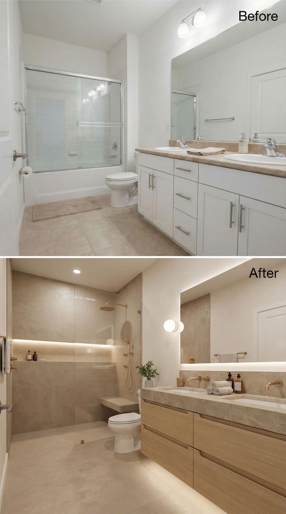 Warm wood vanity cabinetry and ambient LED lighting transform this builder grade bathroom into a sophisticated retreat. Glass shower enclosures replace dated tub-shower combinations, while integrated stone countertops and brass fixtures elevate the entire aesthetic. Strategic accent lighting and continuous material palettes create seamless flow throughout the reimagined space.