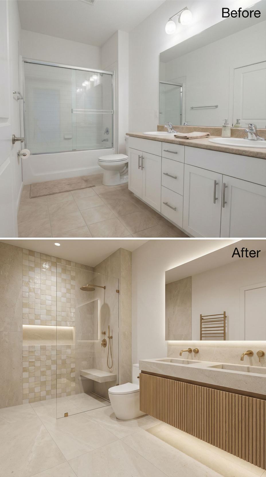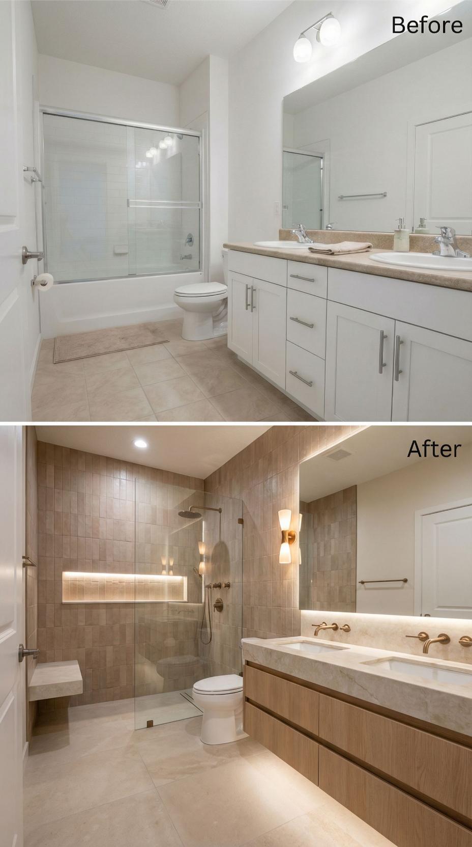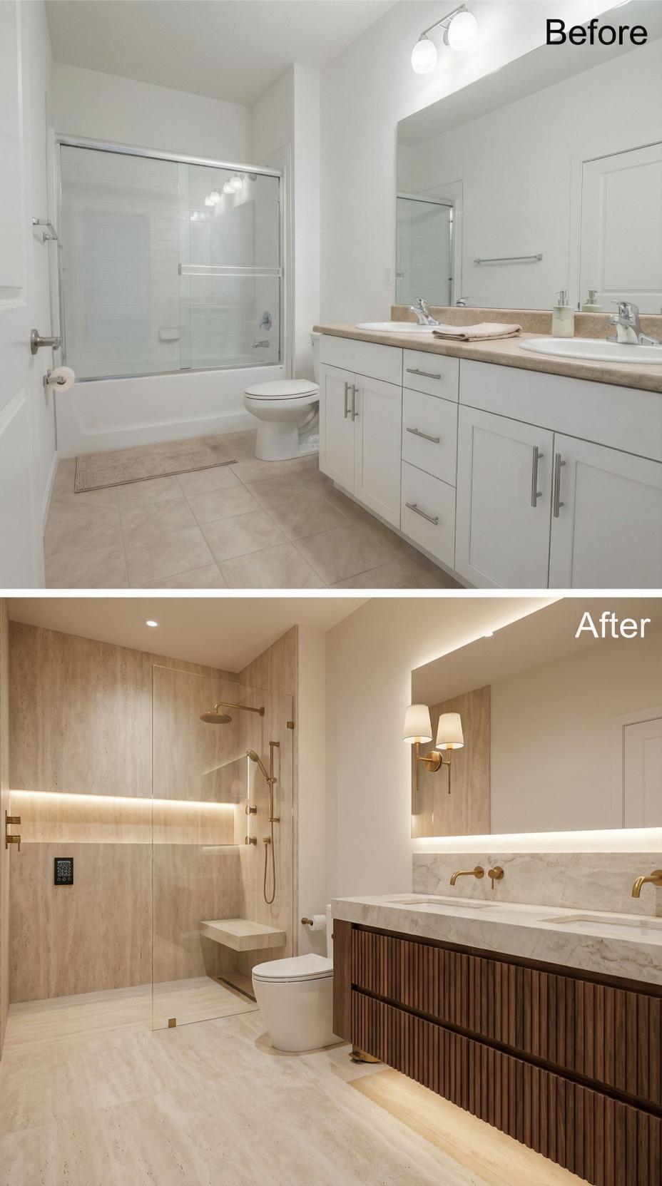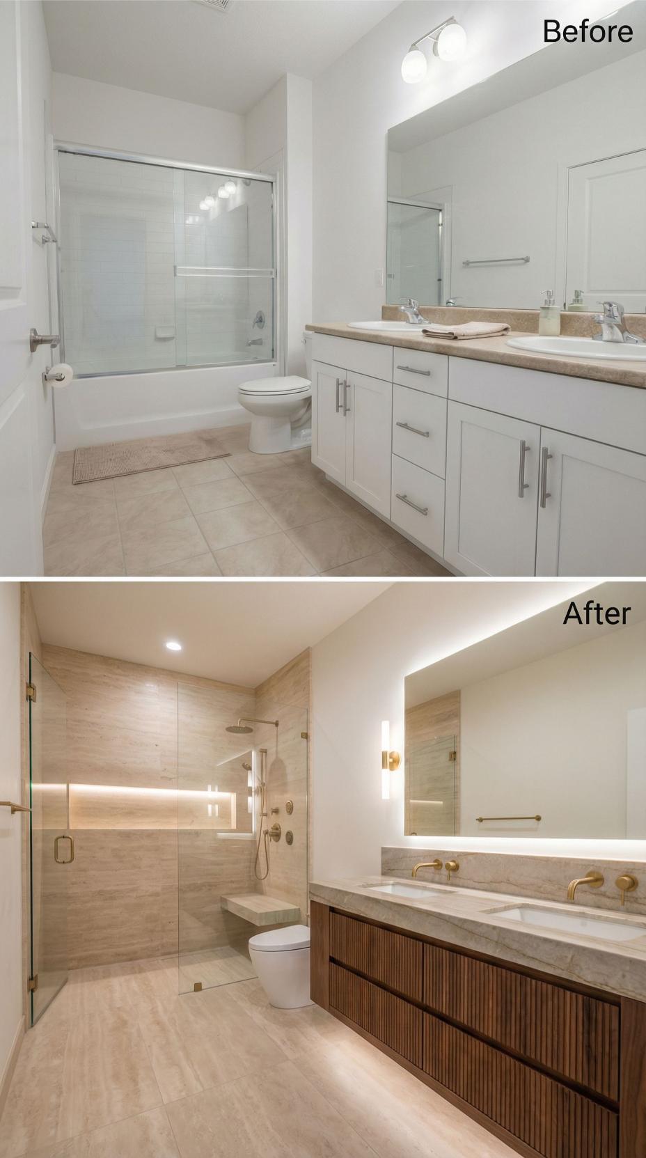 Warm wood vanities with marble countertops replace generic white cabinets, creating sophisticated storage with floating shelves below. The cramped tub-shower combo transforms into an expansive walk-in shower featuring natural stone tiles and brass fixtures. Strategic LED strip lighting under the vanity and behind the mirror adds ambient warmth, while the neutral palette of travertine and walnut finishes elevates this once-basic builder grade bathroom into a hotel-worthy retreat.