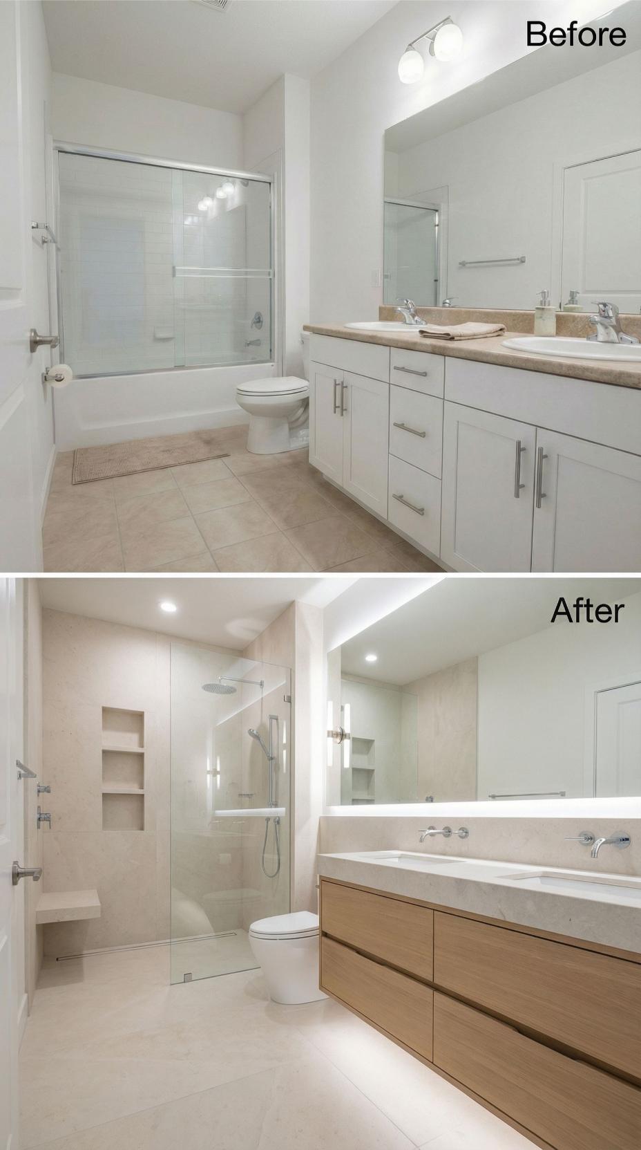 Clean lines and warm wood vanities transform this builder grade bathroom into a sophisticated retreat. The renovation replaces basic white cabinets with sleek floating vanities featuring rich walnut finishes, while a spacious walk-in shower with built-in niches eliminates the cramped tub-shower combo. Neutral stone surfaces and seamless glass create an elevated, hotel-like atmosphere that maximizes both style and functionality.