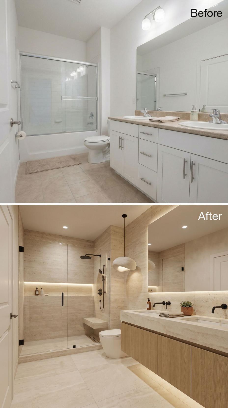 Natural stone transforms this builder grade bathroom into a luxurious spa-like sanctuary. Warm travertine tiles envelope the walls while rich wood vanity cabinetry replaces basic white units. Cove lighting beneath floating shelves adds ambient warmth, and a spacious walk-in shower with rainfall fixture elevates the entire experience from standard to stunning.