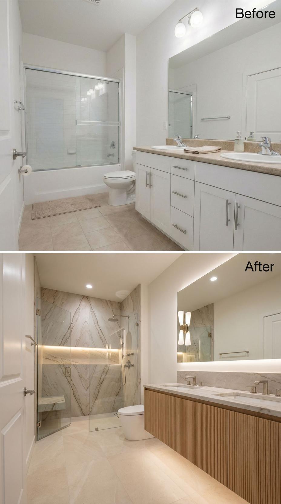 What was once a standard builder grade bathroom with basic white cabinetry and simple fixtures has been transformed into a stunning modern sanctuary. The renovation features dramatic marble walls with bold veining, warm wood vanity cabinetry with fluted details, and sophisticated brass hardware throughout. A spacious walk-in shower with built-in niches replaces the original tub-shower combo, while backlit mirrors and under-cabinet lighting create an elevated, hotel-like ambiance.