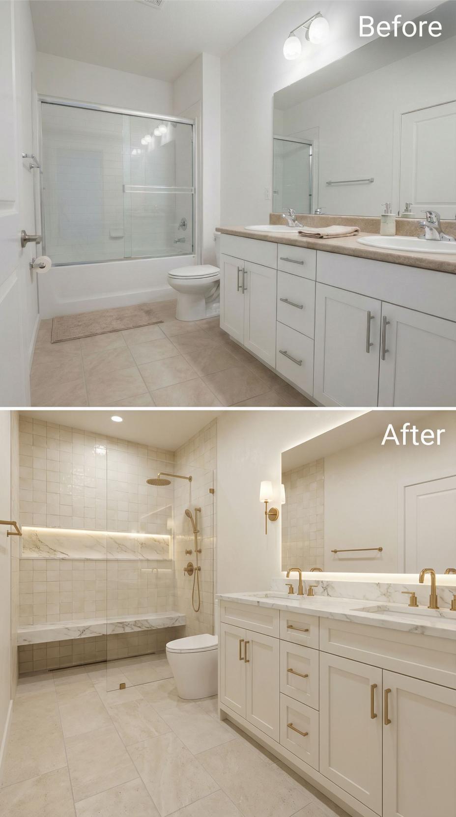 Warm beige tile work and rich marble surfaces completely transformed this builder grade bathroom into a sophisticated retreat. The renovation replaced basic fixtures with brass hardware and elevated finishes, while strategic lighting creates an inviting glow. A spacious walk-in shower with built-in bench seating and floating vanity storage maximize both style and functionality in the reimagined space.