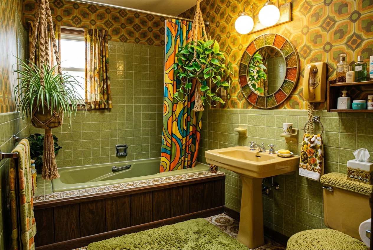 This list of 33 bathroom elements will take you on a tour through the accessories, fixtures, and design quirks that really set the decade apart. You’ll spot earth-toned tiles, novelty items, and those unmistakable architectural touches that turned the average bathroom into a groovy, time-stamped snapshot of American style.