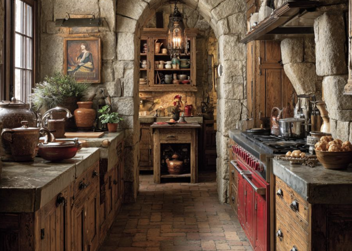 This charming petite kitchen pairs rustic limestone walls with a vintage-style range, creating a warm and nostalgic atmosphere. The combination of stone textures and classic detailing brings a sense of old-world romance into the compact space. Every inch feels thoughtfully curated, proving that rustic luxury can thrive beautifully in a small, cottage-like footprint.