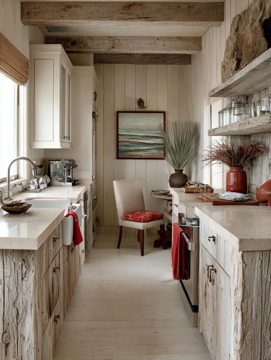 Coastal Rustic Micro-Galley Kitchen with Driftwood Cabinetry and Soft Whites