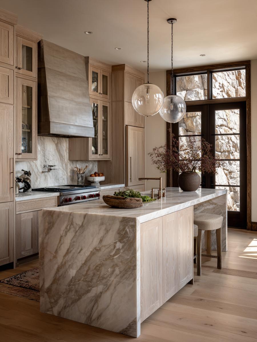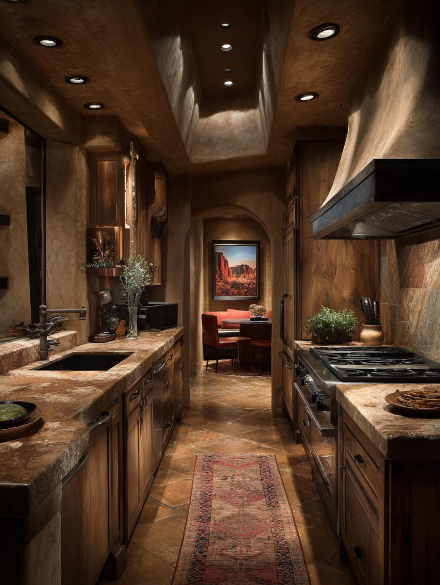 This desert rustic kitchen embraces warm sandstone textures, soft earthy tones, and streamlined cabinetry that suits a narrow galley layout. The muted palette creates a soothing backdrop, while high-end finishes elevate the compact footprint. Thoughtful lighting casts a gentle glow across the stone surfaces, giving the kitchen a grounded, elegant feel that echoes modern desert retreats.
