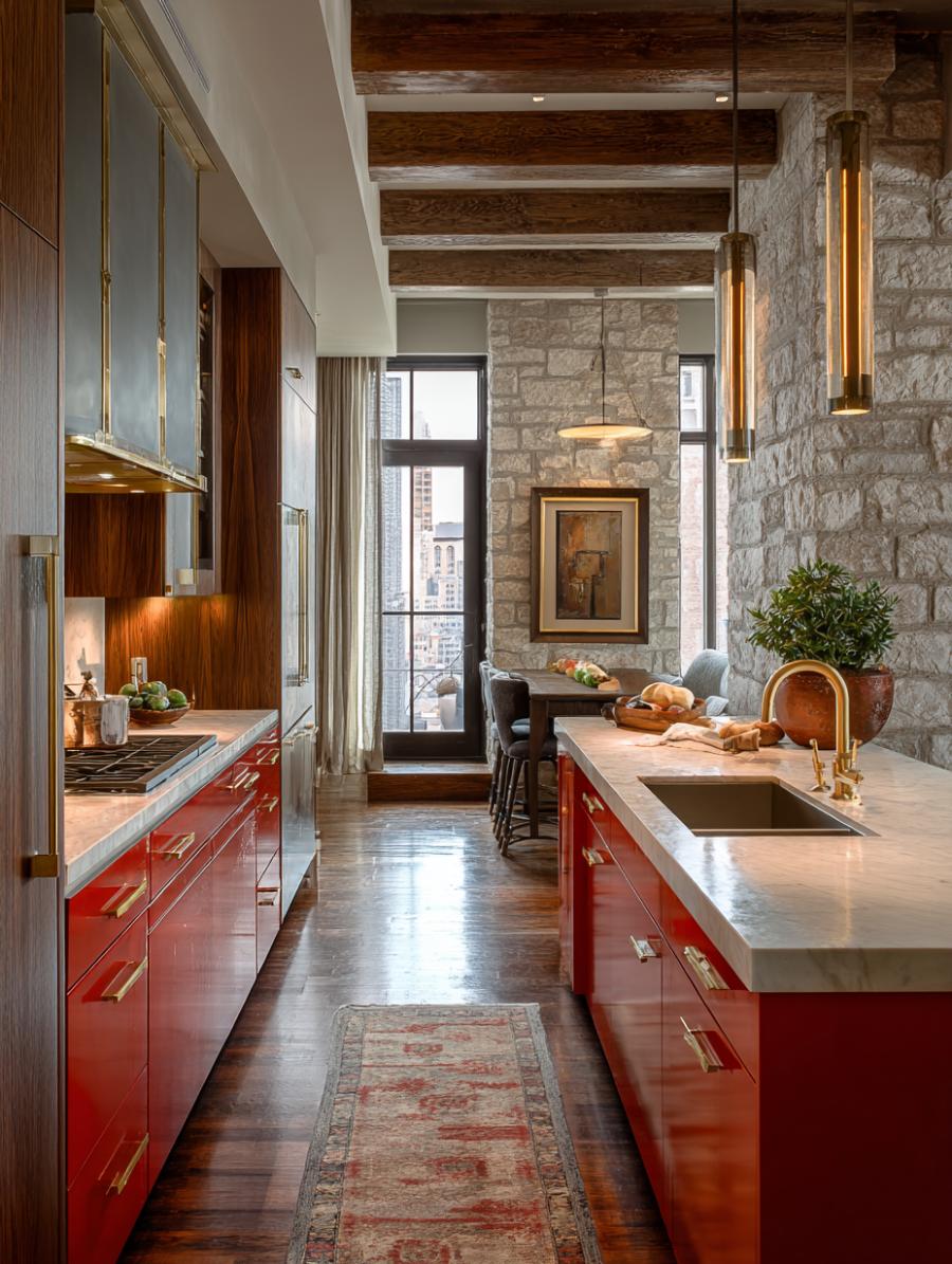 This tiny galley kitchen pairs matte red cabinetry with soft stone details, creating a balanced, high-contrast rustic look. Warm lighting highlights the textures and keeps the narrow layout feeling intimate rather than enclosed. It’s a striking small-space design that blends bold color with natural materials to create an inviting and luxurious atmosphere.