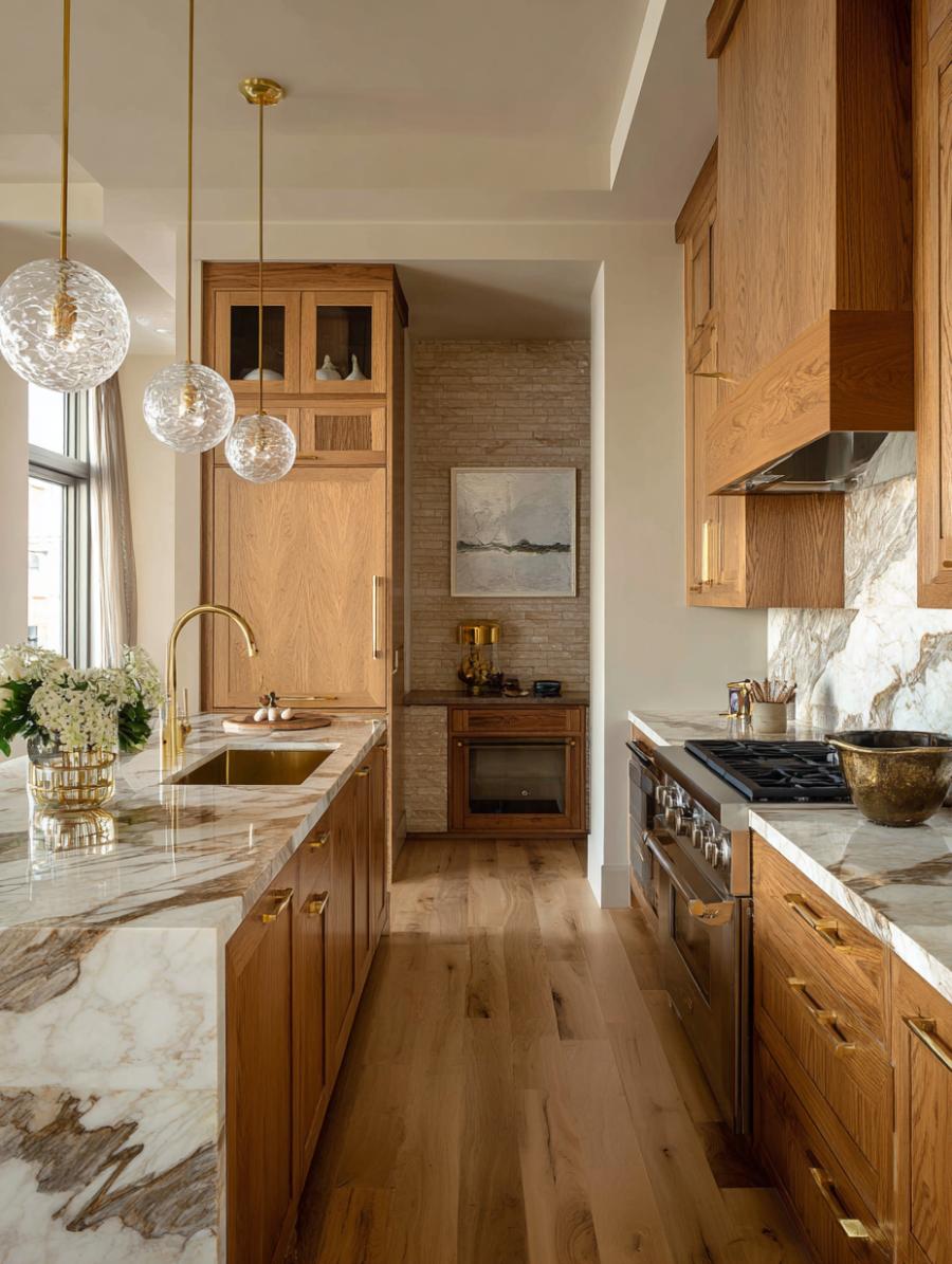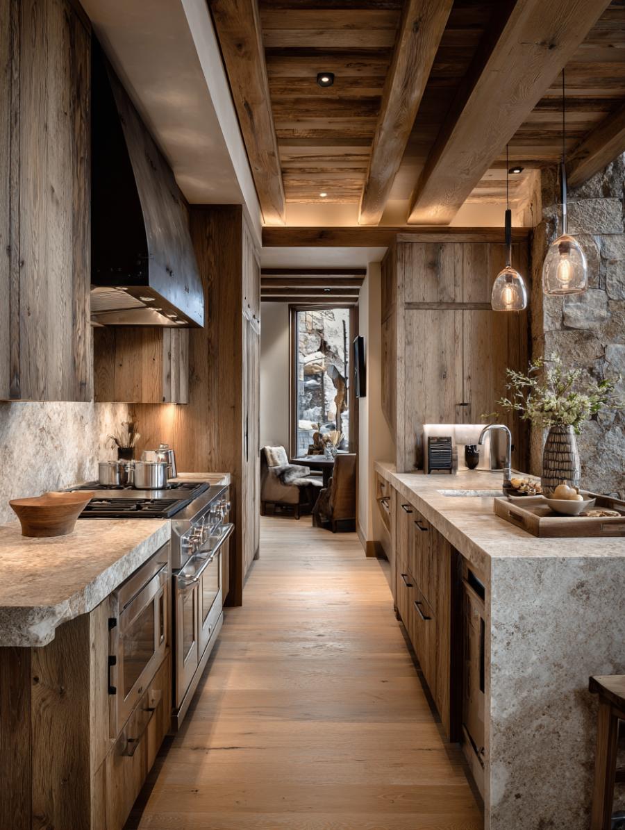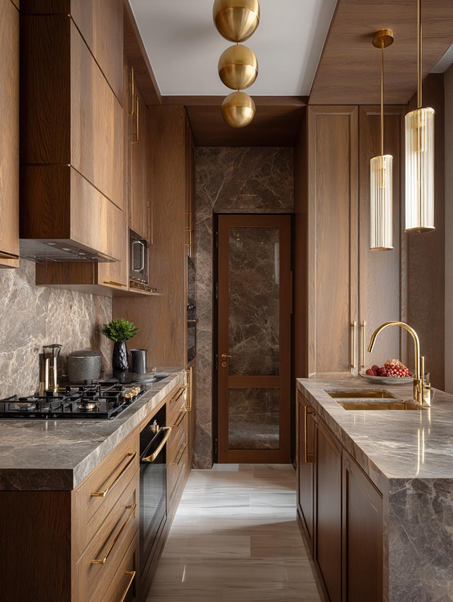 Designed for city living, this rustic luxury galley kitchen pairs sleek wood cabinetry with cool stone surfaces for a refined urban feel. Integrated appliances keep the space streamlined, while warm lighting offsets the modern edges. The result is a kitchen that feels compact yet richly layered, merging rustic charm with contemporary sophistication in a small but impactful footprint.