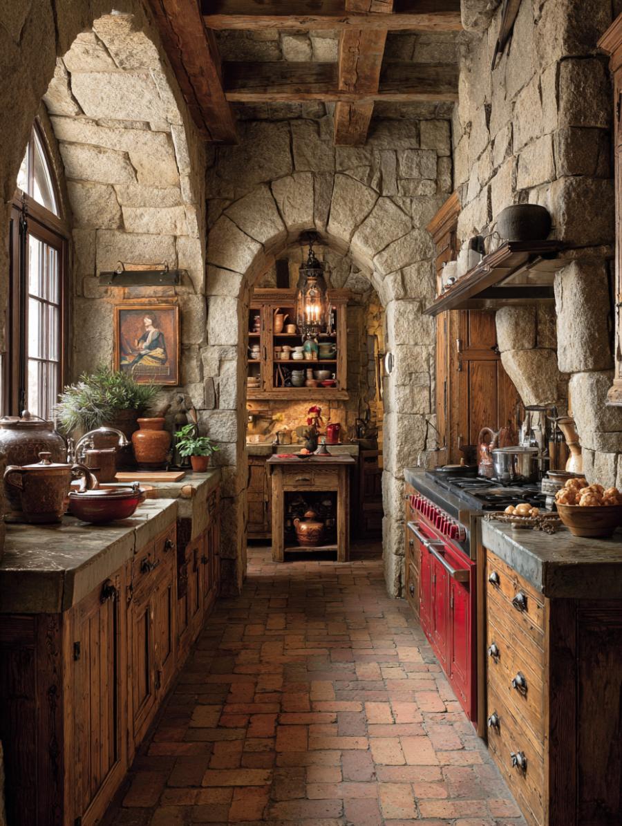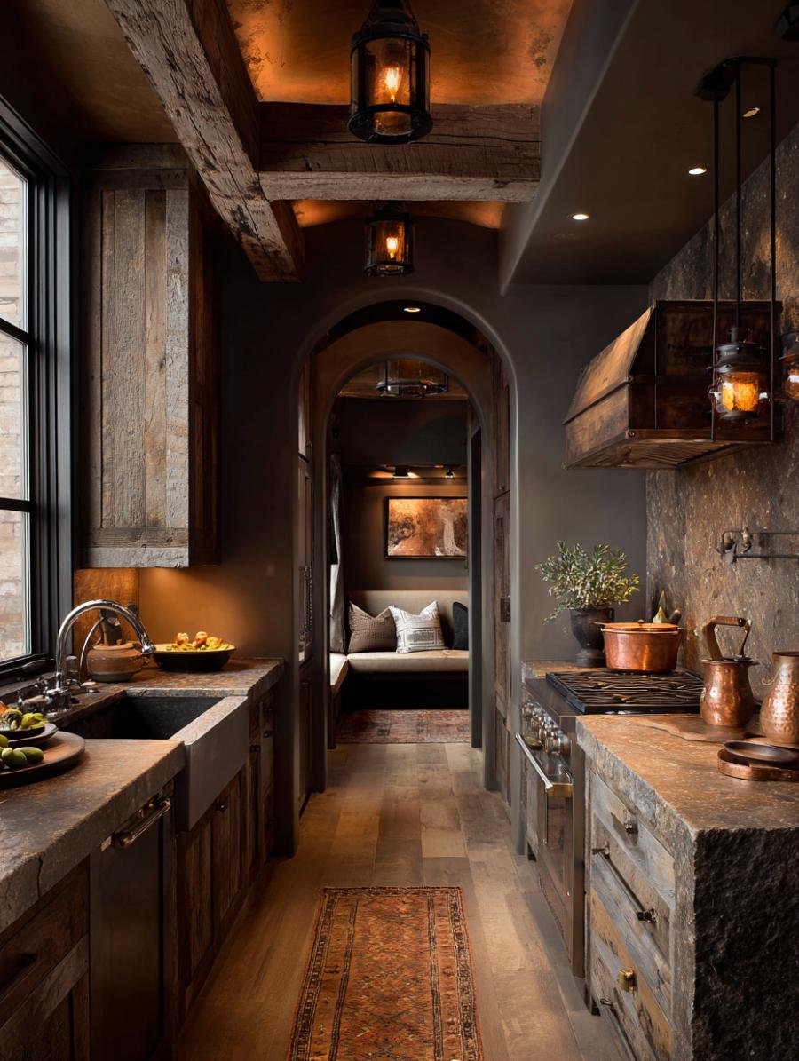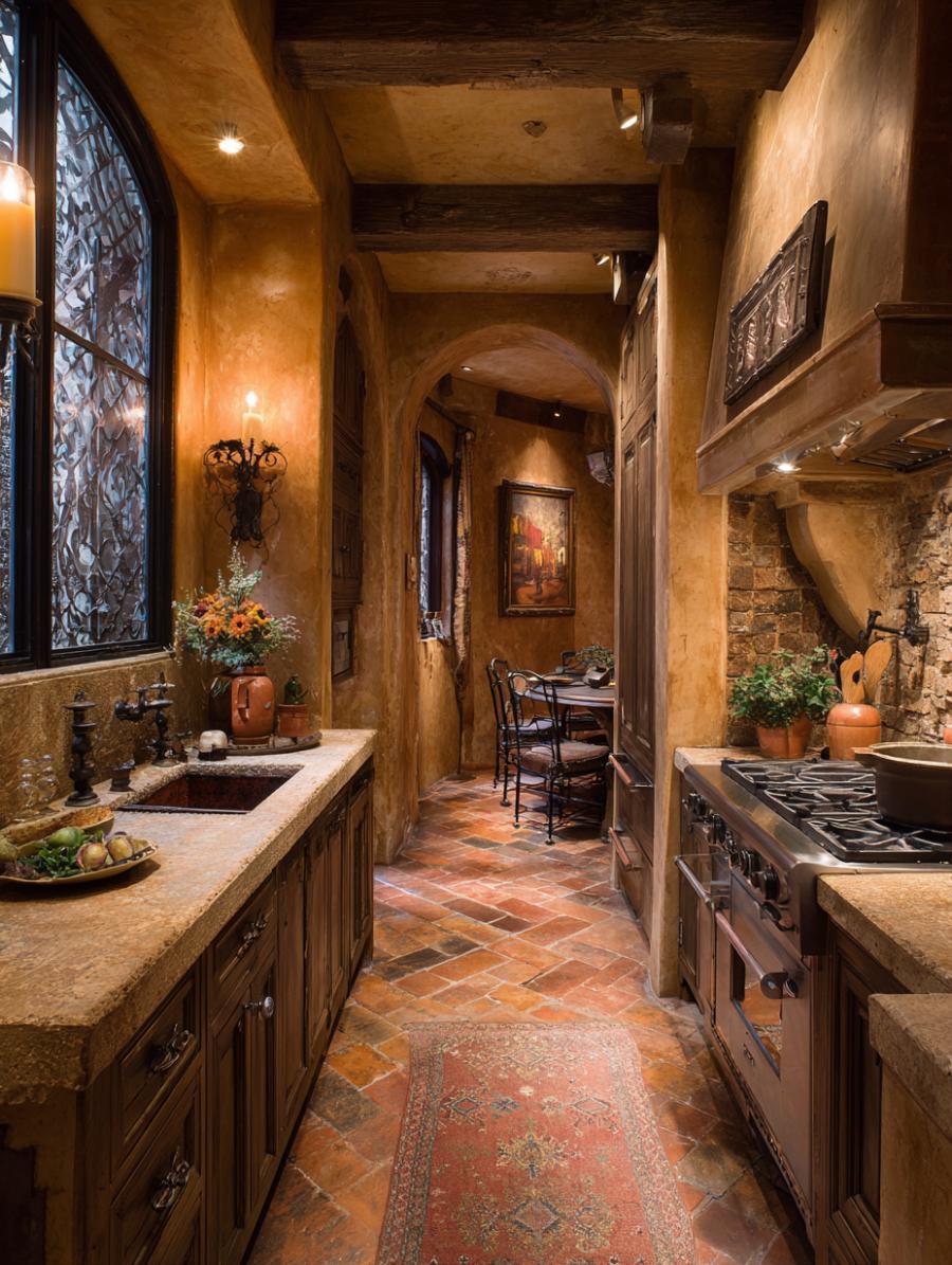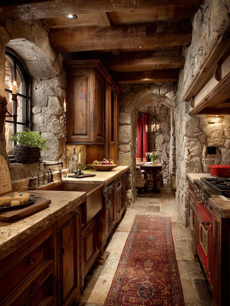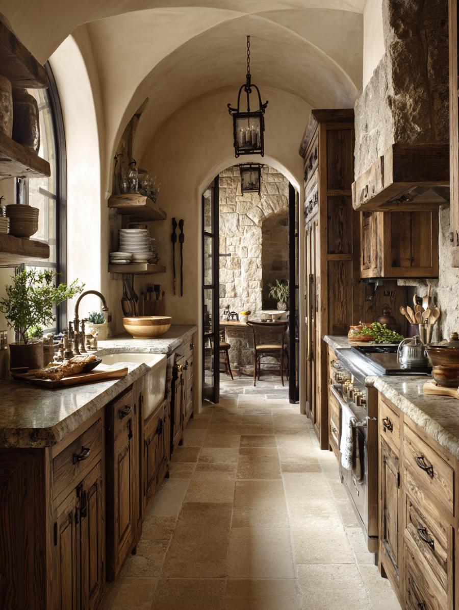 This old-world rustic galley kitchen expands on the theme with richly textured stone surfaces and warm, inviting lighting. The narrow space feels deeply atmospheric, embracing historic charm through natural materials and traditional craftsmanship. Even in a tight layout, the kitchen feels robust, elegant, and full of character.