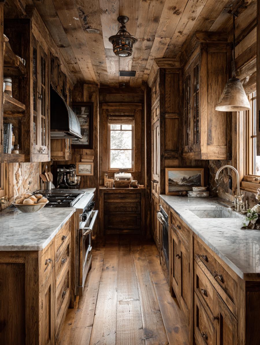 This small rustic kitchen blends reclaimed wood textures with a narrow island that enhances function while preserving space. The warm tones and handcrafted feel give the galley layout a cozy, lived-in character. Thoughtful lighting and natural materials work together to create a warm, welcoming environment that feels beautifully upscale despite its compact footprint.