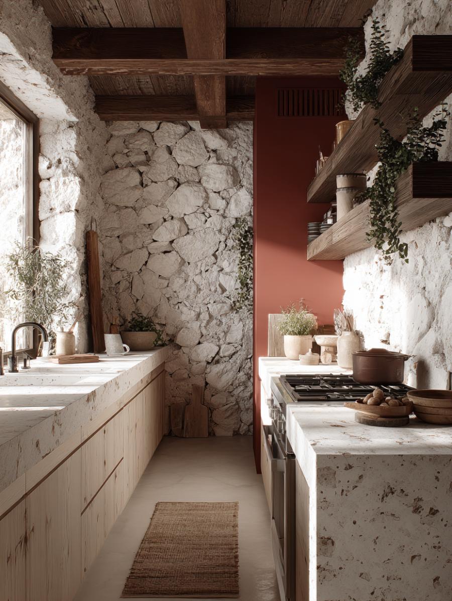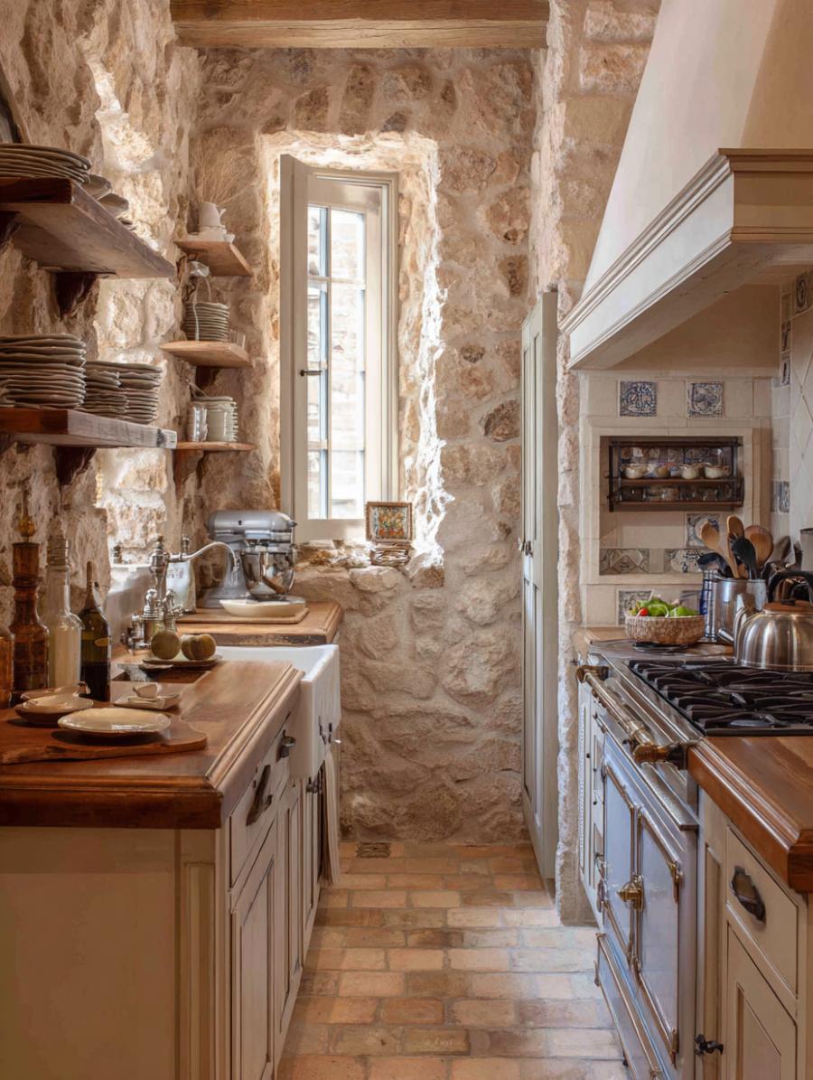 Old-World Rustic Galley Kitchen with Stone Walls and Timber Detailing