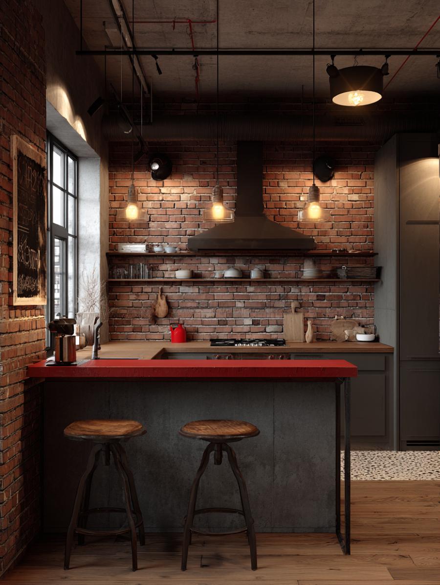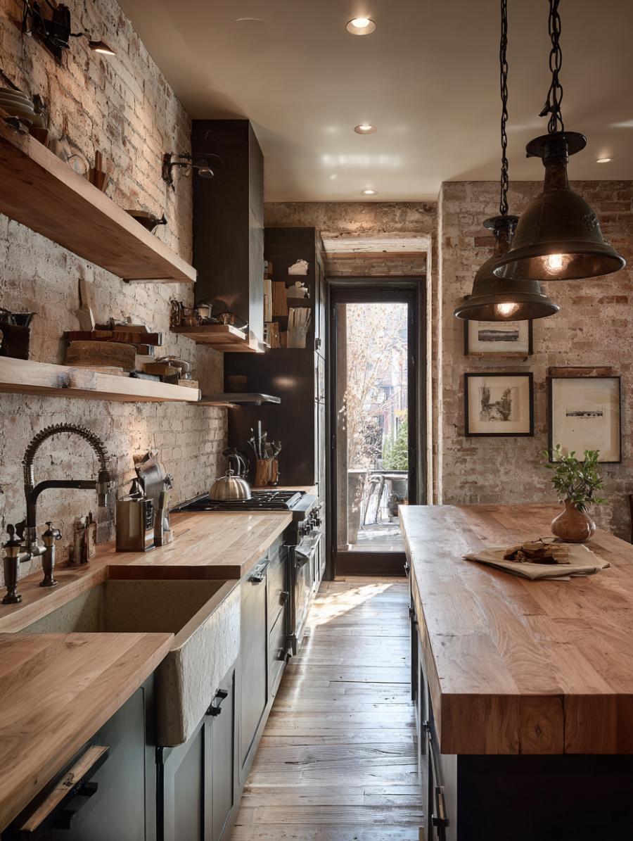 Rustic Industrial Wall-Galley Kitchen with Brick Feature Wall