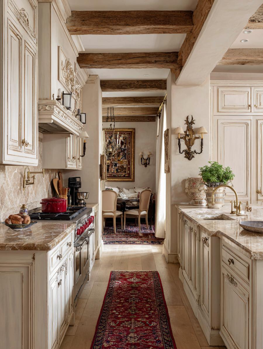 Rustic French Wall-Galley Kitchen with Carved White Cabinetry