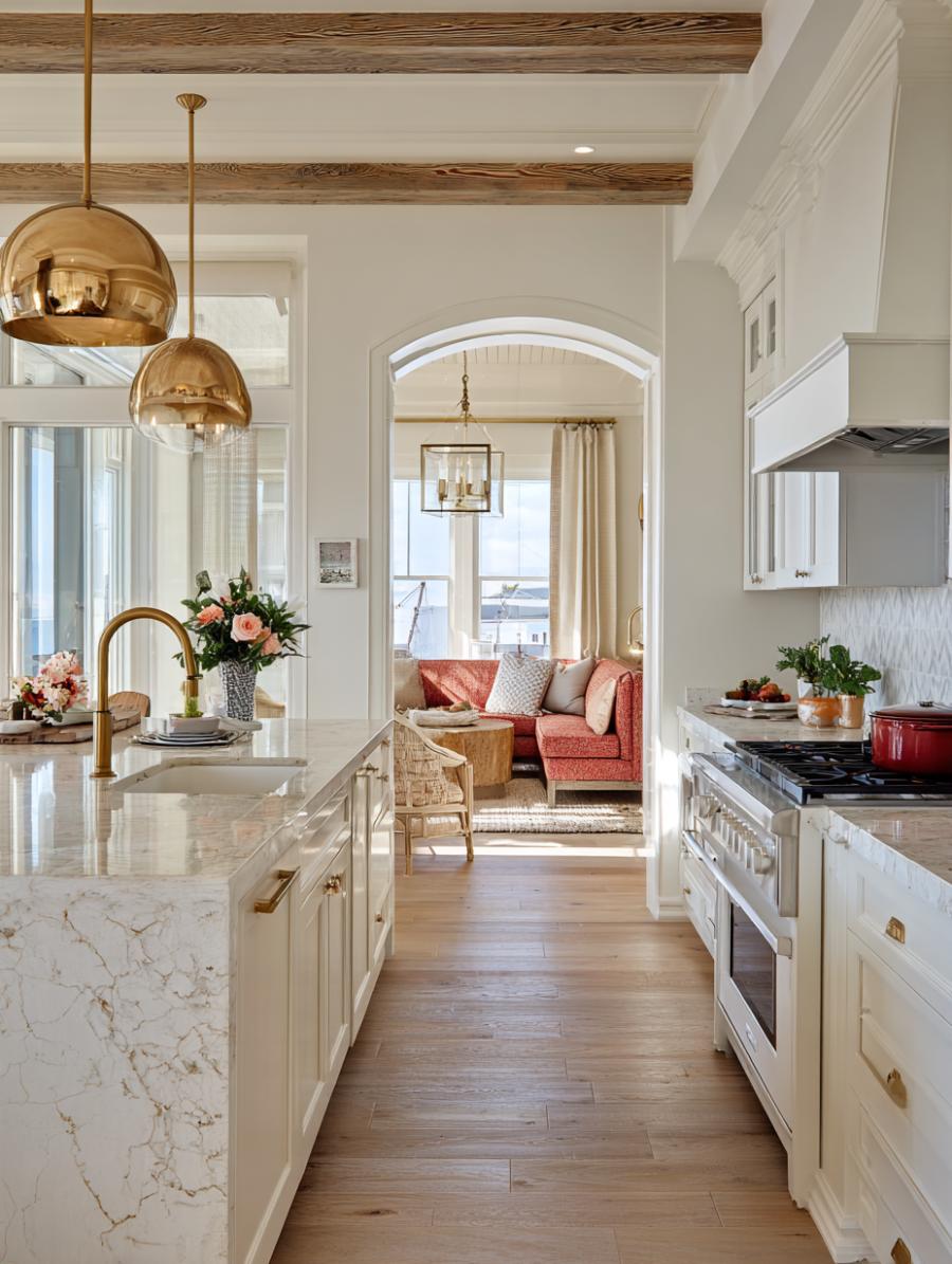 This small rustic glam kitchen combines gleaming stone surfaces with warm wood tones for a striking contrast. The narrow island adds sculptural elegance without overwhelming the galley layout. Metallic accents and soft lighting elevate the look, creating a luxurious feel in a compact footprint. It’s a sophisticated blend of rustic character and glamorous finishes.