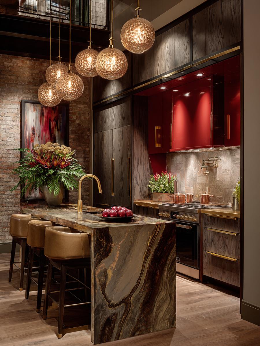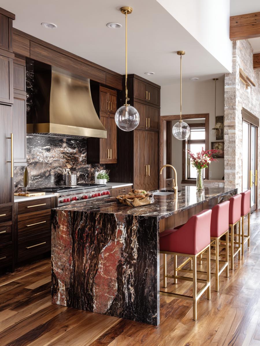 Here, the rustic glam style continues with polished wood cabinetry and stone textures that give the narrow space a refined glow. The compact island acts as a functional focal point, while strategic lighting brings depth and elegance. Despite its tight proportions, the kitchen feels upscale and dramatic, merging rustic warmth with sleek modern glamour.