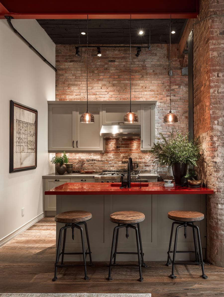 This rustic industrial galley kitchen highlights a striking brick feature wall that adds warmth and texture to the narrow layout. Matte cabinetry and metal hardware amplify the urban edge, while soft lighting keeps the mood inviting. The combination of raw materials and thoughtful detailing creates a compact space that feels stylish, functional, and rich with character.
